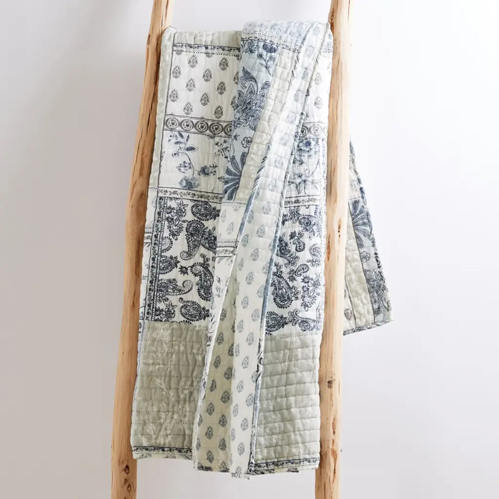 The Aliza Reversible Throw by Levtex Home is inspired by artistic folk art. Offered in blue, navy, taupe and cream, this design will immediately transform any room in your home. This throw features an array of florals, medallions and paisleys in various tones of blue and cream on the front, reversing to a mini blue medallion on a cream gorund. on the back. The Throw (50x60in.) has a cotton front and back, filled with a cotton-rich filler, and is machine washable. Enjoy this for years to come!