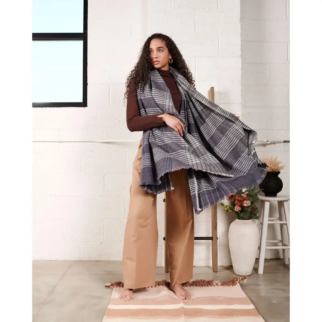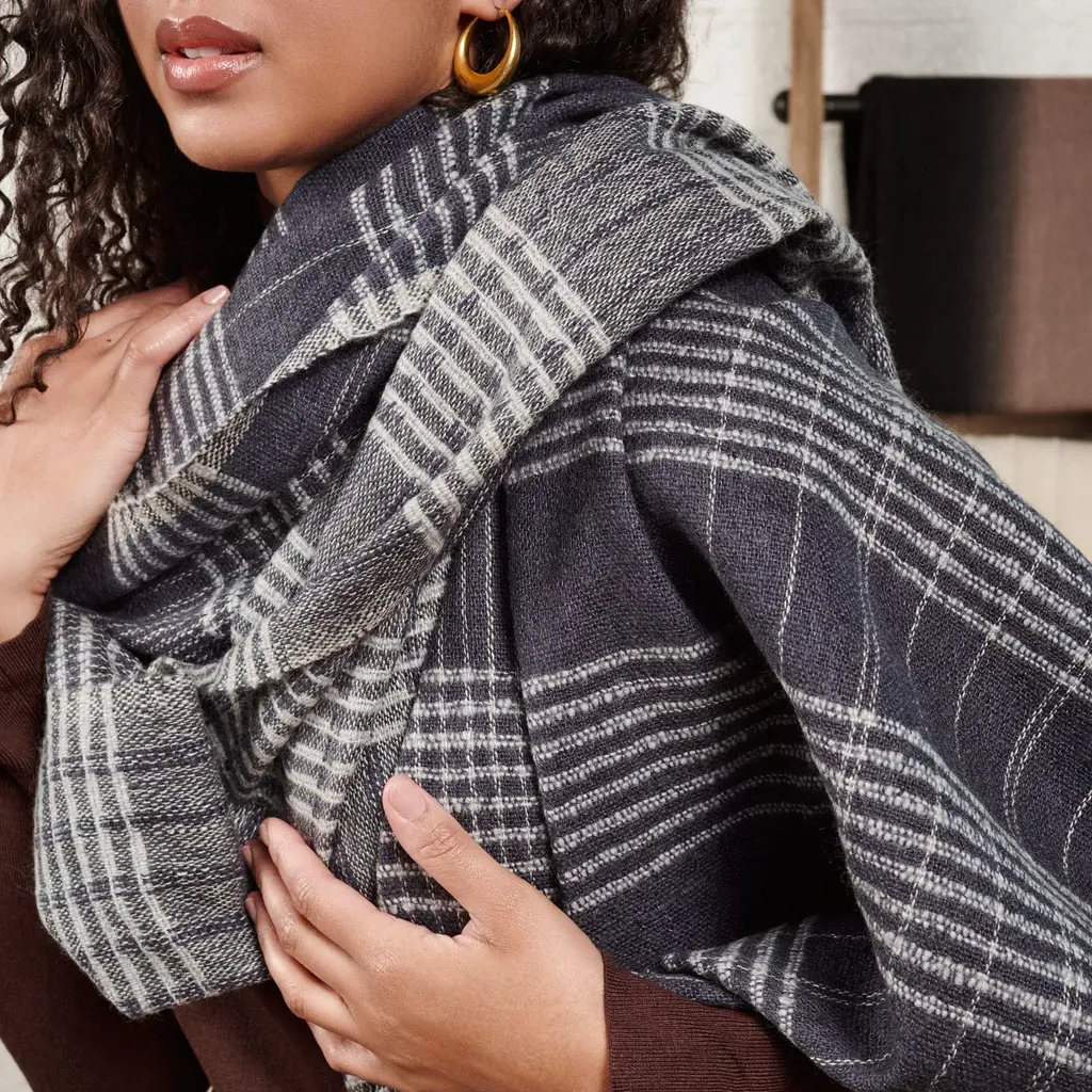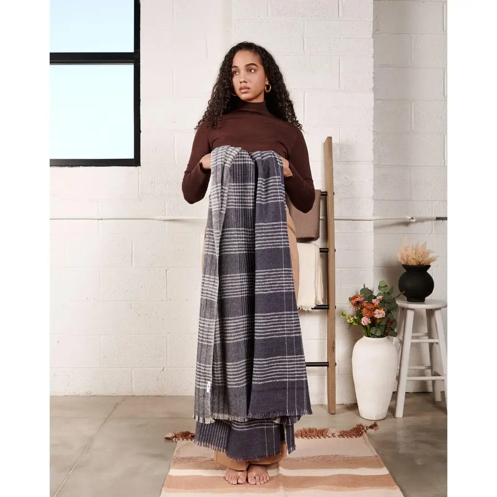 Alloy Throw is a modern take on combining stripes & checks pattern in a classic color palette and fine detail of hand weaving done meticulously on a handwoven textile. Each piece is 100% handmade making it a unique sustainable throw which is both classic and minimal modern in its appeal. Alloy throw is soft to touch and wears well over time. Requiring attention to detail and finishing, this throw luxuriously combines heritage value. high quality craftsmanship & it is reversible to arrange and use. Fringes are kept short for a modern look. For this textile, we are using only the highest quality of 100% pure merino from Australia. Eco friendly dyes Swiss dyes are specifically engineered to promote the lifespan of each throw. As this luxurious piece is completely handmade from start to finish, each piece is unique. Classic in design, Alloy is a timeless throw / blanket will complement your personal or living spaces, is a thoughtful gift and also supports artisan communities ethically. Throw Size: 110 cm X 210 cm Material: 100% soft merino from Australia , 100% pure linen from Belgium. Colors: Alloy gray , navy and white Artisan base: Ethically & responsibly handwoven by artisans in Nepal. Wash care: Gently hand wash using gentle detergents. Hang dry in cool shaded place or delicately dry clean only. What Makes Your Purchase Sustainable ? Eco friendly dyes free of toxic chemicals used. Support employment of women artisans. 100% handmade ethical manufacturing process by artisans. Uses only 100% natural responsibly sourced materials. Small batch production ensures higher quality & less wastage.