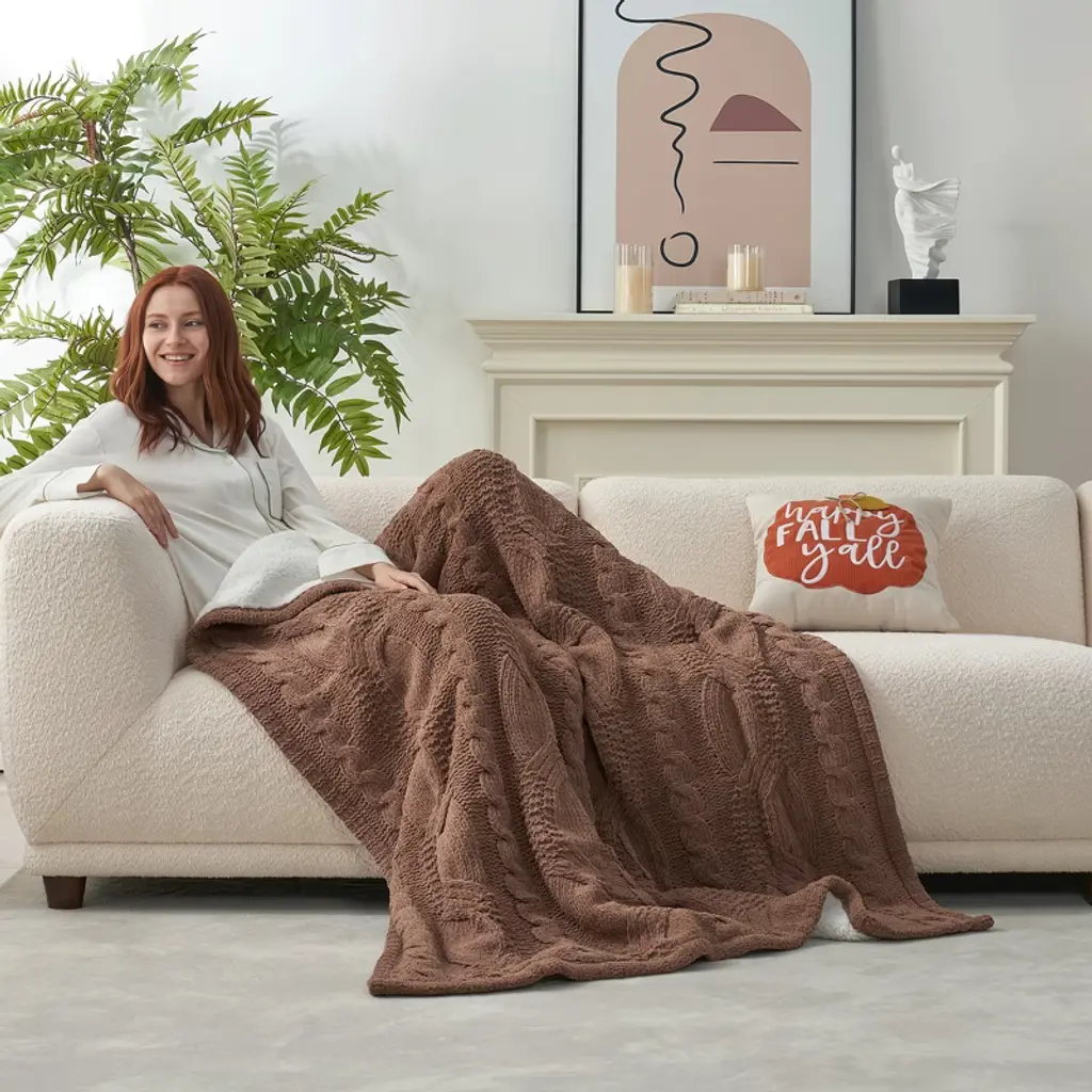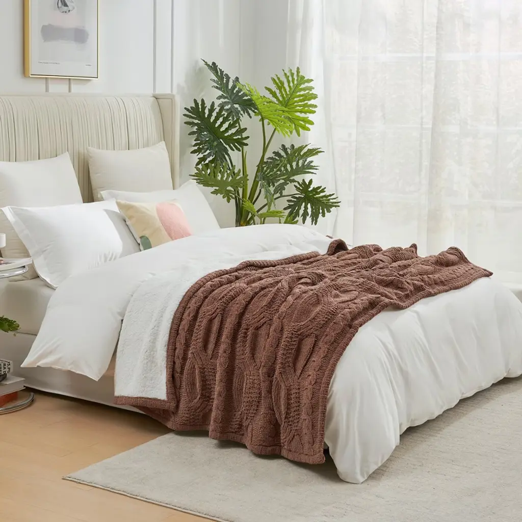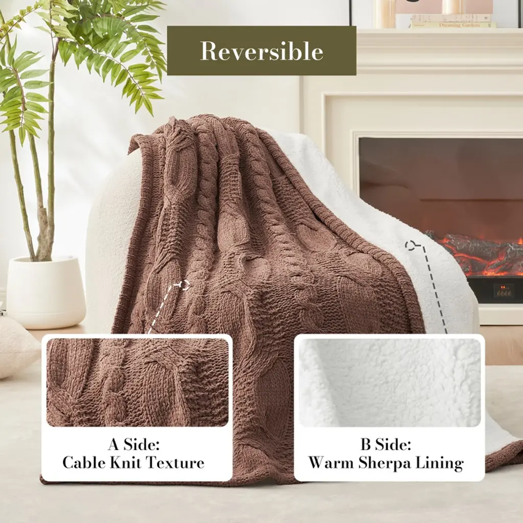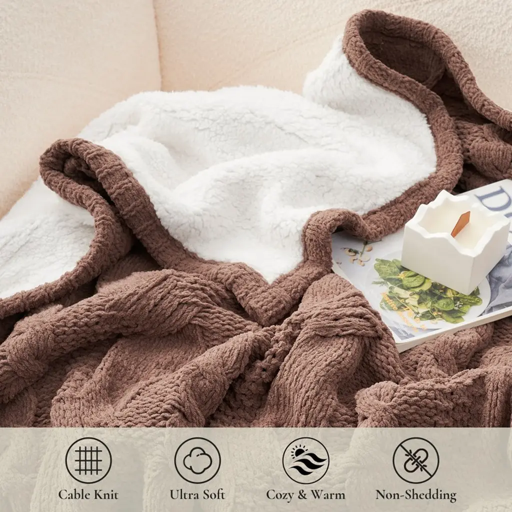Amelie Home Reversible Chenille Cable Knit Throw Blanket ,60"x80",brown