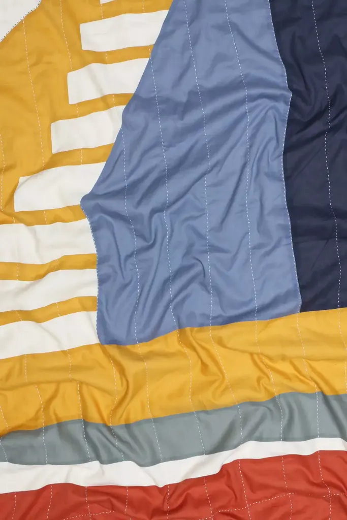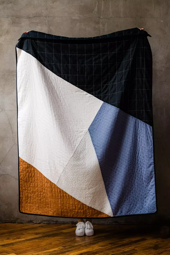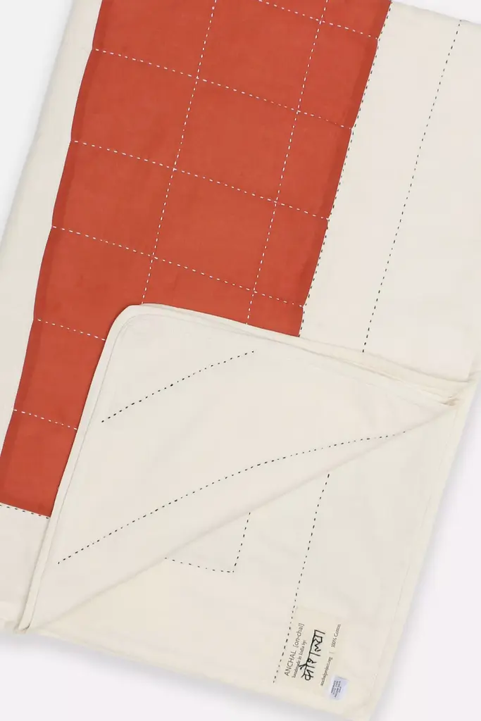 This intricate patchwork quilt creates a sense of movement and depth complemented by hand-stitched kantha embellishments. Drape it over your favorite chair for a modern, cozy feel.Anchal [on-chal] is an award-winning, social enterprise that uses design thinking to create innovative products and sustainable employment for exploited women worldwide. The contemporary geometric designs are defined by sophisticated patchwork and aggregated stitch patterns, revolutionizing traditional quilting techniques. Anchal's home goods and fashion accessories are hand-stitched by 130 artisans in Ajmer, India with layers of the softest cotton since 2010. Every purchase of an Anchal product has an immediate impact and provides an artisan with a full-time job, health care benefits, design training, and educational workshops.* Quilted front, solid bone back* 100% cotton* Dry clean recommended* Imported#### *Dimensions** 74"L, 54"W