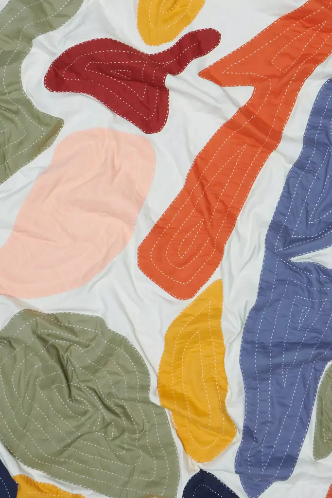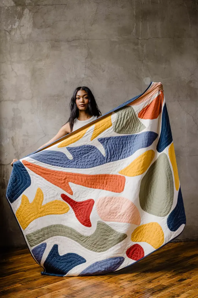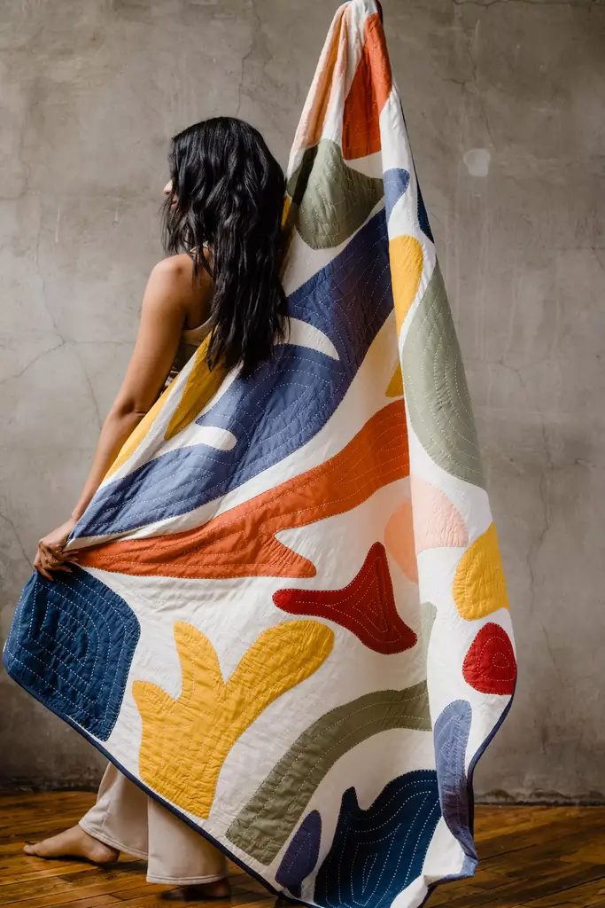 The Petal Quilt Throw is the perfect choice for any room in your home, designed to impart a sense of artistic beauty combined with luxurious comfort. Made from an indulgent 6 layers of organic cotton, this throw will provide a touch of nature and warmth to any room.Anchal [on-chal] is an award-winning, social enterprise that uses design thinking to create innovative products and sustainable employment for exploited women worldwide. The contemporary geometric designs are defined by sophisticated patchwork and aggregated stitch patterns, revolutionizing traditional quilting techniques. Anchal's home goods and fashion accessories are hand-stitched by 130 artisans in Ajmer, India with layers of the softest GOTS certified organic cotton since 2010. Every purchase of an Anchal product has an immediate impact and provides an artisan with a full-time job, health care benefits, design training, and educational workshops.* 100% organic cotton* Dry clean recommended* Imported#### *Dimensions** 74"L, 54"W