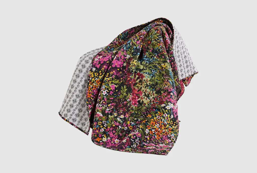 The Basel Reversible Quilted Throw by Levtex Home is inspired by a a bright, dense English country garden. Offered in shades of dense floral pattern, this design will immediately transform your bed, couch or favorite chair. Made with the softest lightweight cotton, this reversible throw features a bright floral garden design in black, fuchsia, purple, orange, blue and yellow on the front on the one side, reversing to a black and white geometric on the other. The Quilted Throw is machine washable. Snuggle up under this versatile throw and enjoy it for years to come.