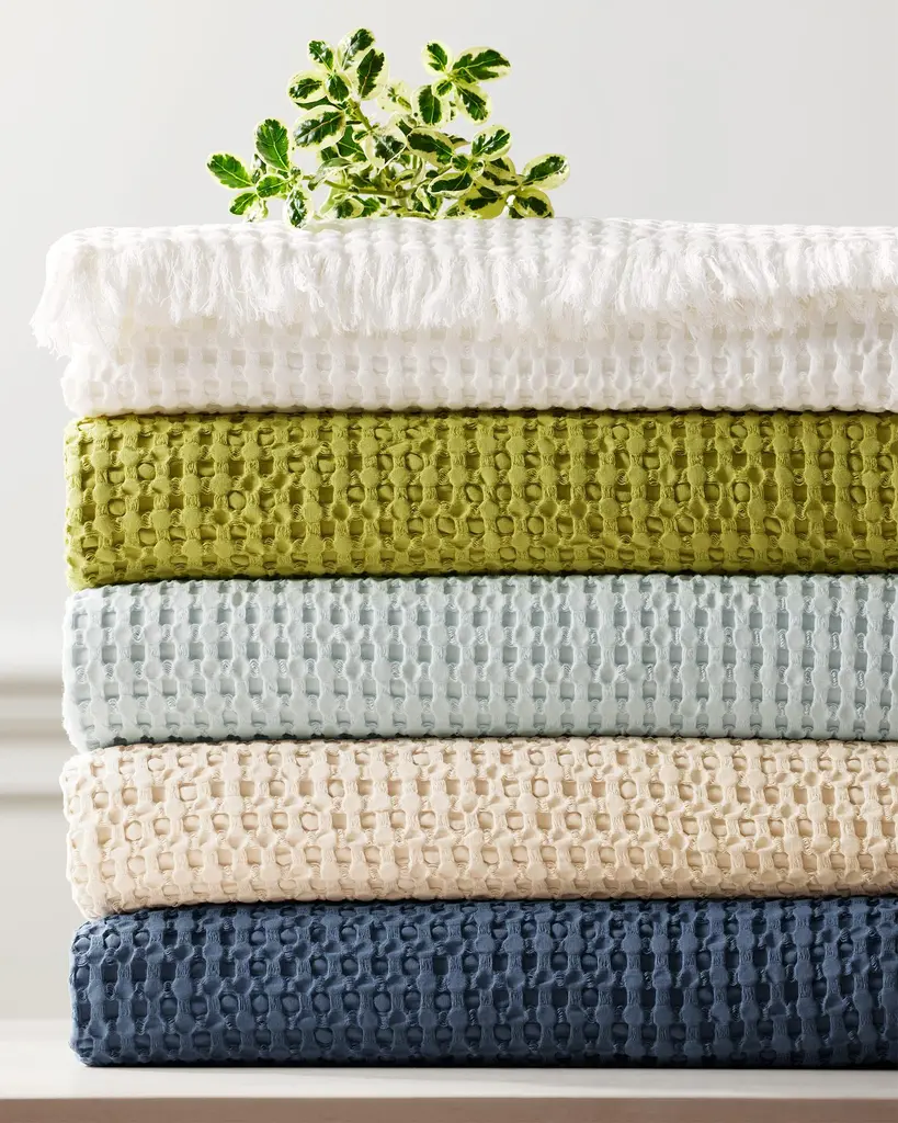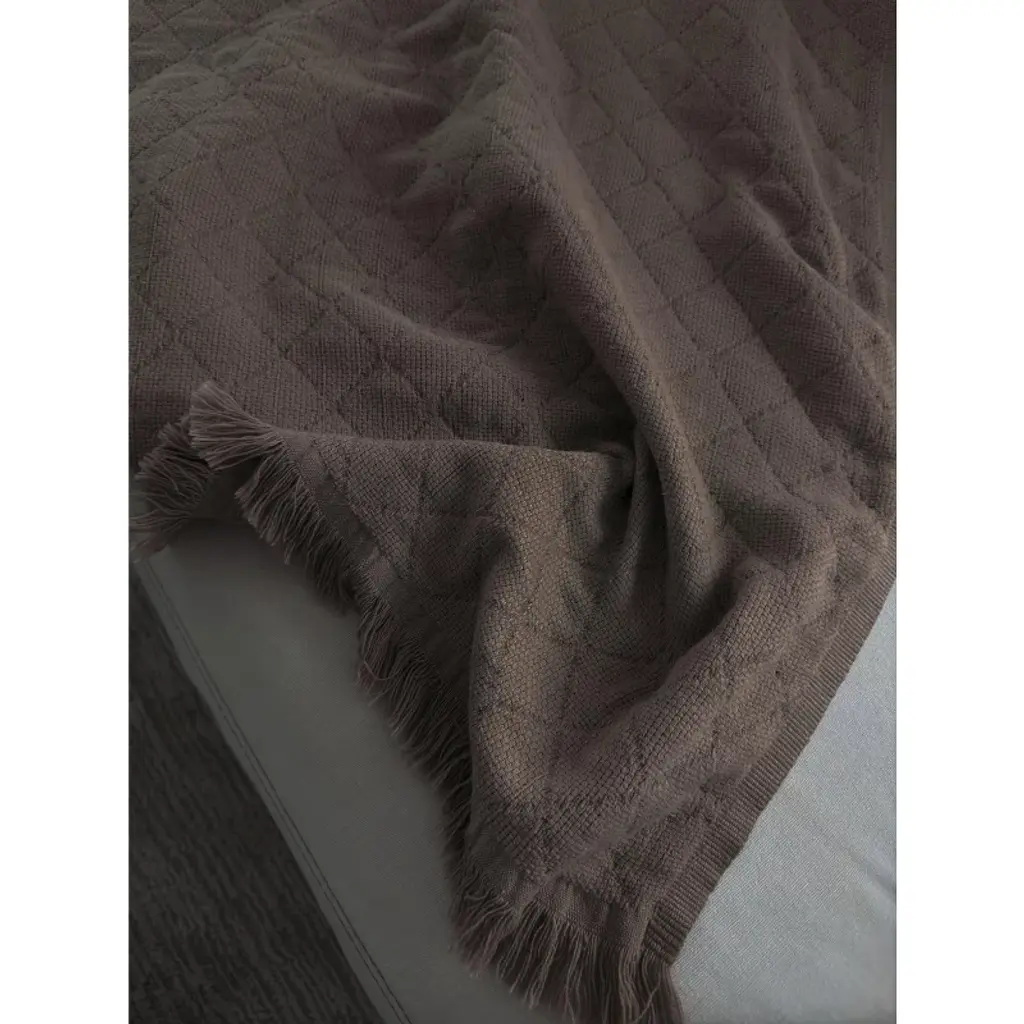 For breezy summer evenings. A textured waffle weave enhanced with an eyelash fringe. Whispering warmth.