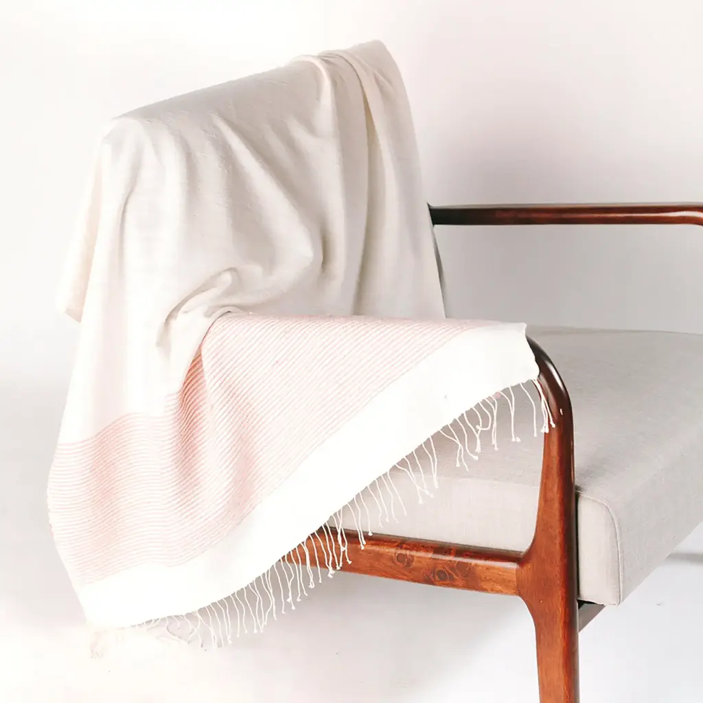 The Bela Blush Throw Blanket is handmade in Ethiopia. The blush pink throw blanket is skillfully hand spun using 100% cotton. The cozy pink throw is washed, dyed and woven by master artisans, resulting in a comfortable blanket that you’ll never want to relax on the couch without. The pink throw blanket with fringe also makes a stunning addition to a small sofa or loveseat.