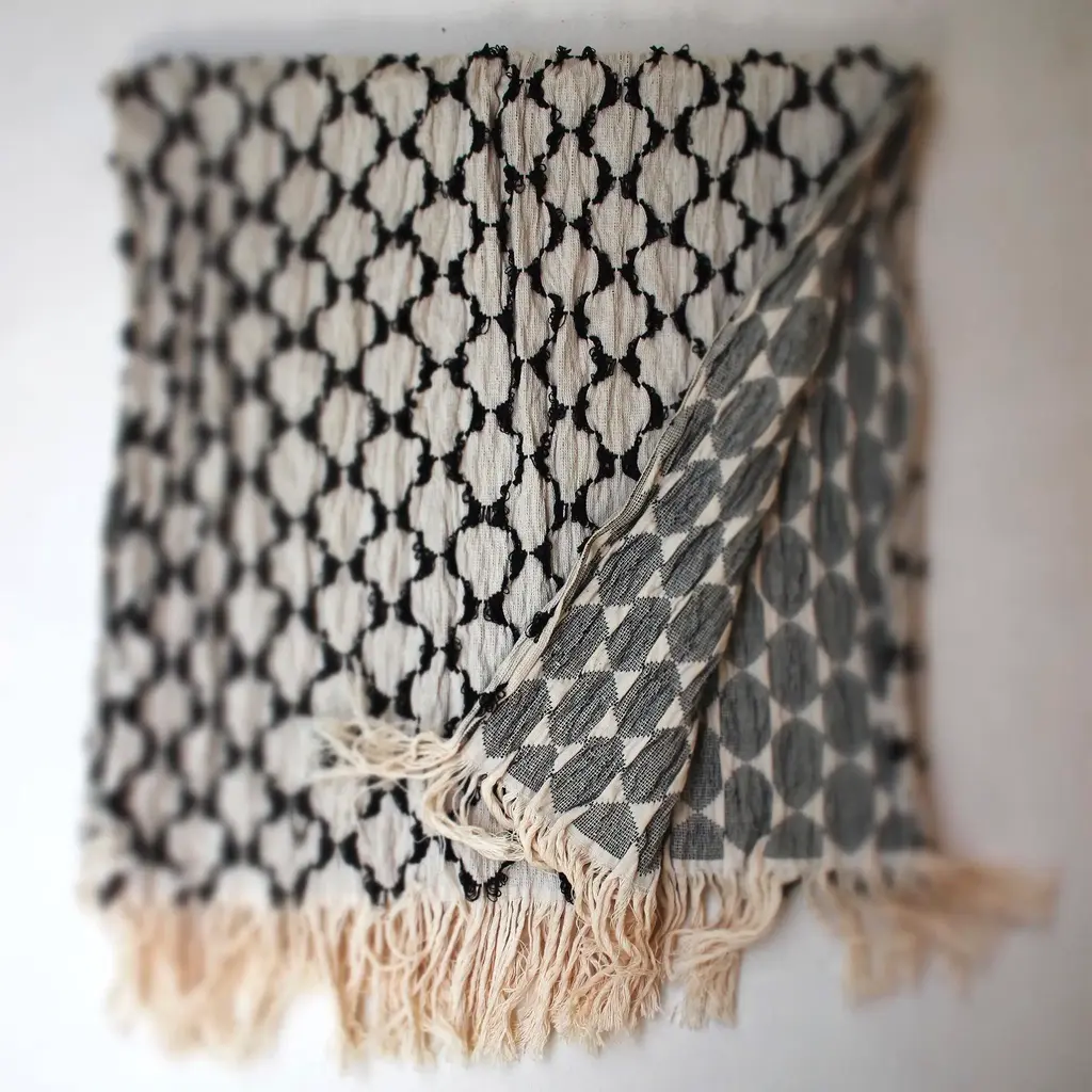 The Biddew Luxury Throw Blanket is handmade in Senegal using traditional weaving techniques. Two Manjak master weavers expertly make each soft organic cotton throw blanket, creating a luxurious and long-lasting woven blanket for sofas. This organic throw blanket has a modern design that is reversible. Keep one folded as an extra blanket on a living room couch. The organic cotton blanket is warm enough to use during the colder months, too. Both of the luxury throw blanket ends have a short fringe.