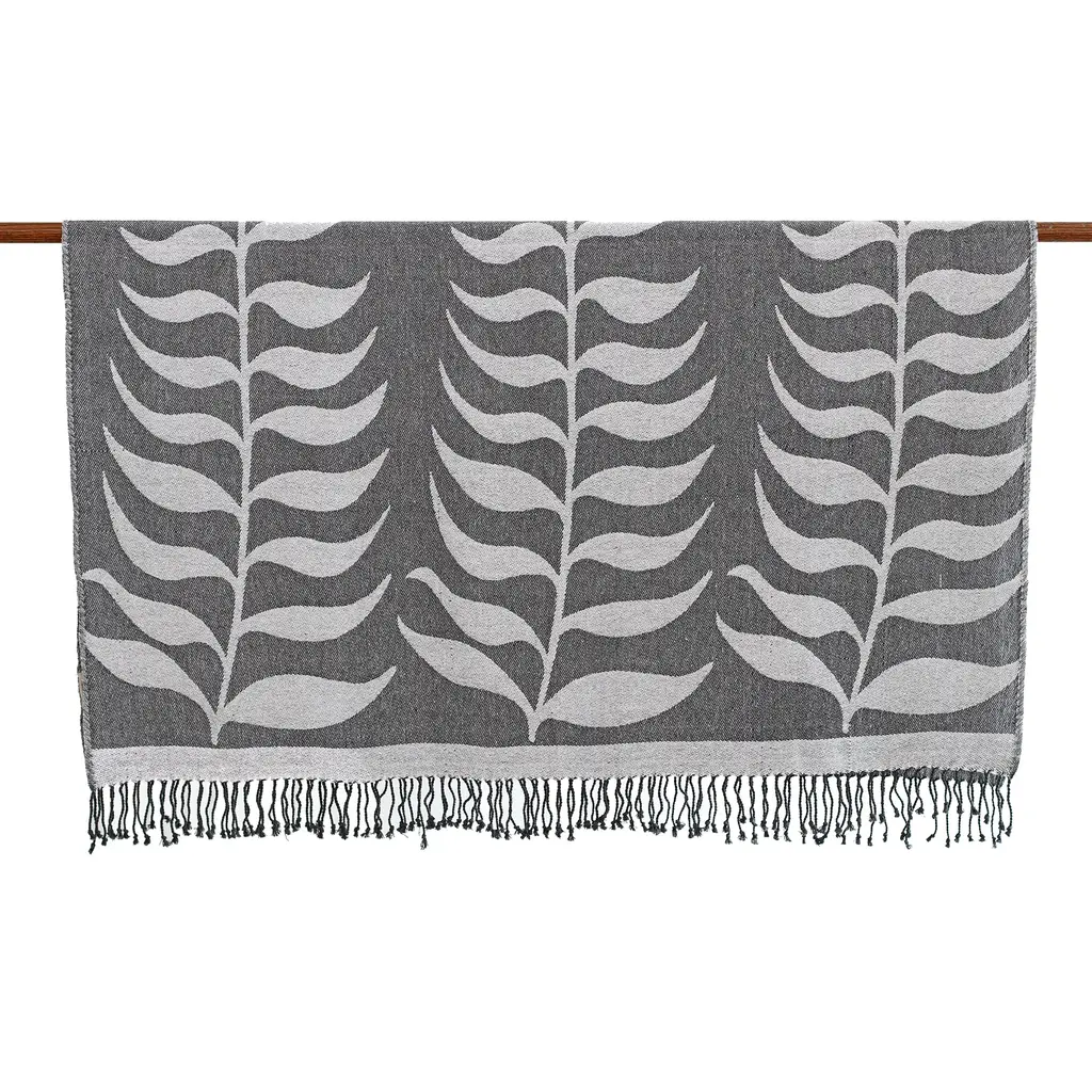 Black And White Leafy Cotton Throw With Fringes- Eternal Foliage