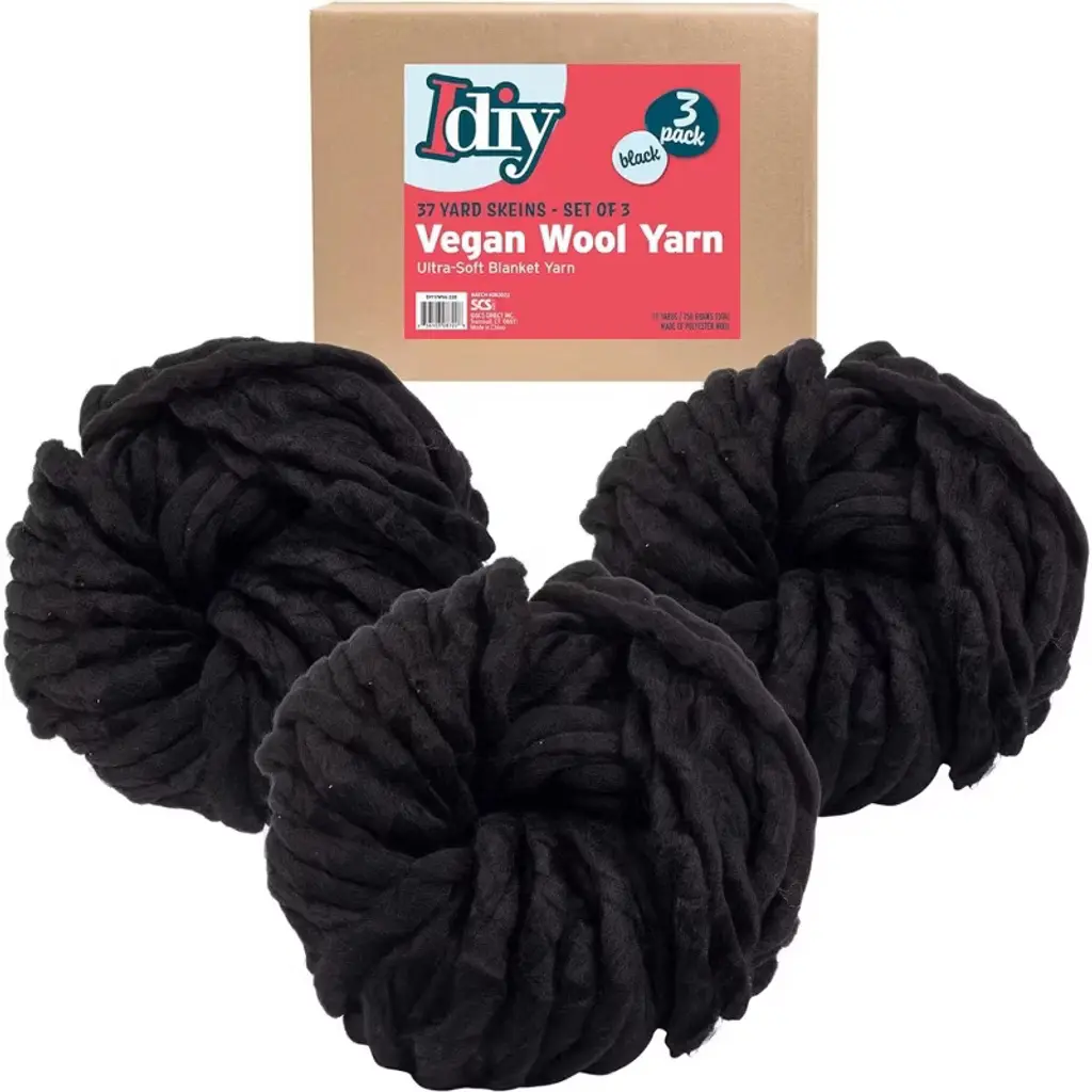 Black Wool Yarn 3 Pack (111 Yards Total, 37 Each Skein) Chunky, Vegan, Fluffy Polyester Yarn - Soft Blankets, Arm Knitting, Crocheting & Diy Crafts