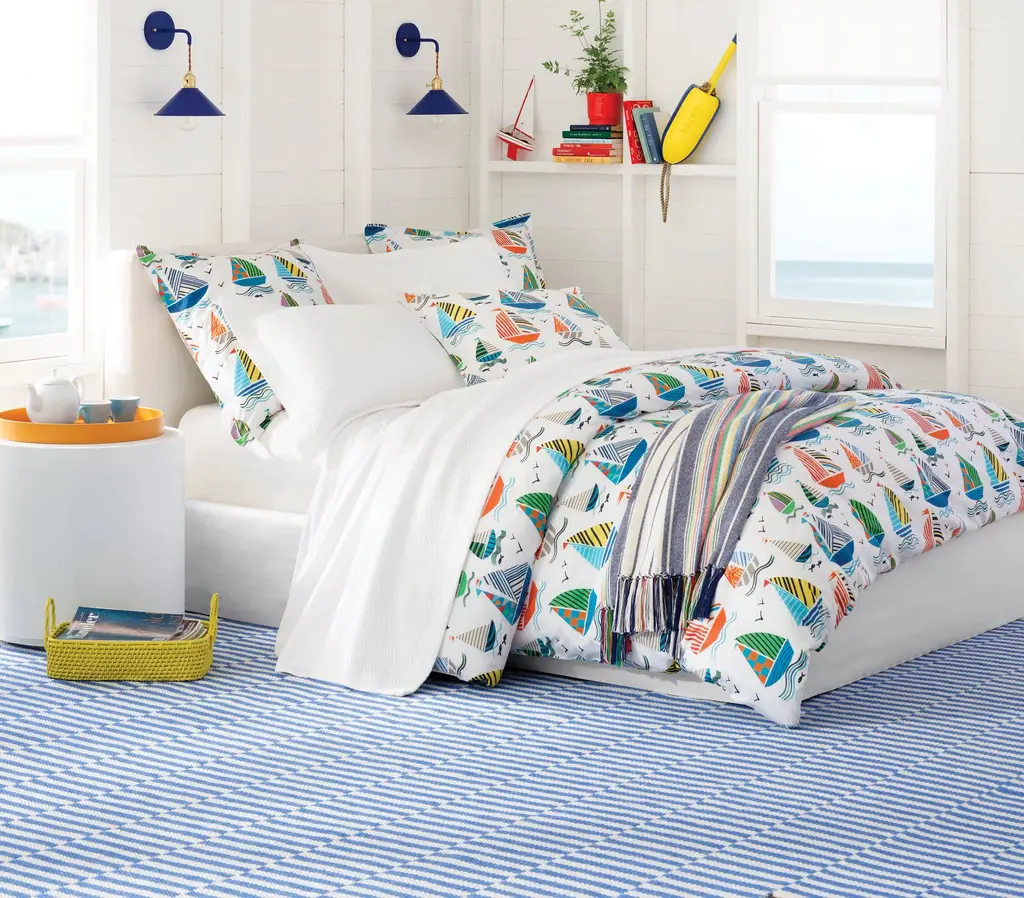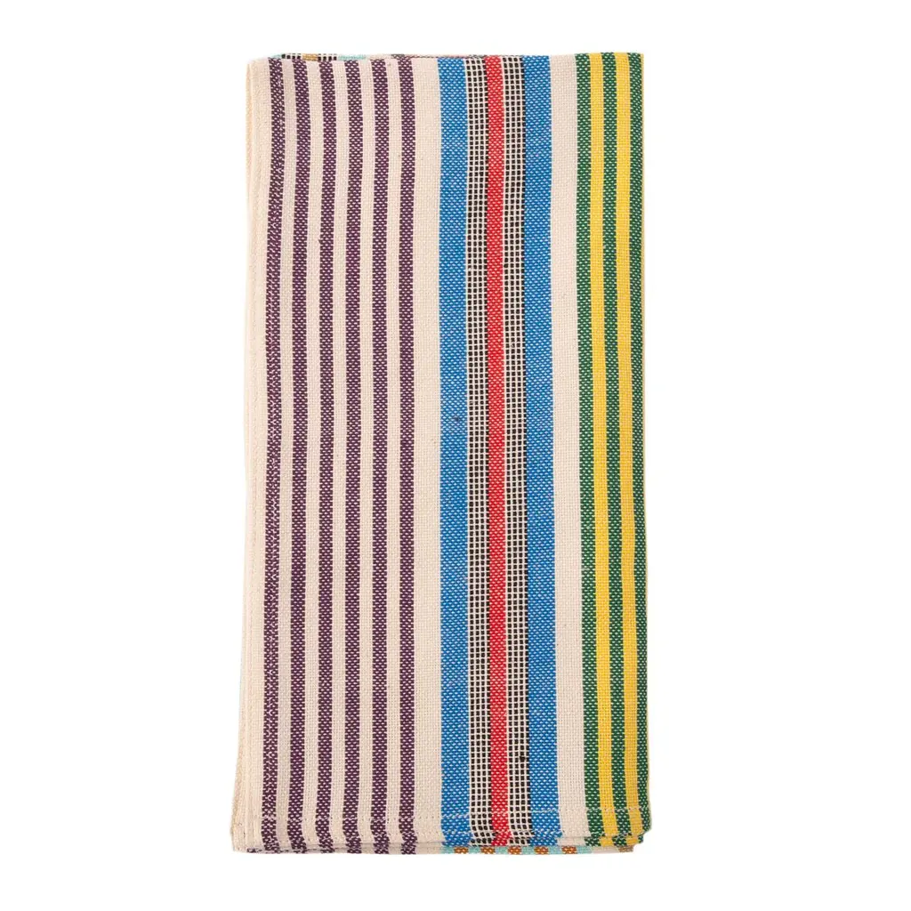 This homespun cotton weave throw features Indigo chambray Breton stripes on a creamy Ivory ground framed by a colorful variegated border and finished with a hand-knotted self-fringe. Great as an extra beach layer, tossed over the arm of a chaise or artfully folded on a stool or bench.
