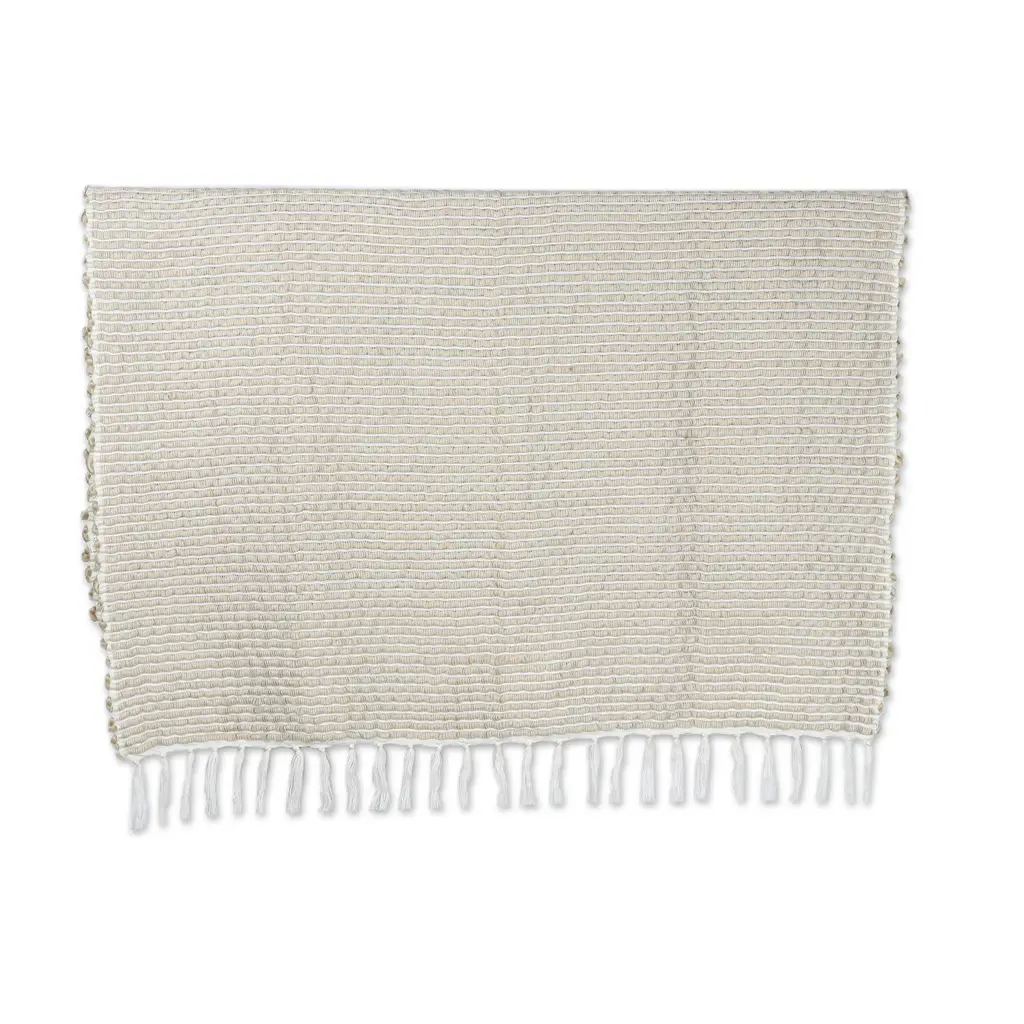 Warm and comfortable, this throw blanket is the perfect complement to a cozy and relaxing day. Crafted by Indian artisans and presented by Sandeep Malhotra, the fringed accessory features a woven design of acrylic threads and a palette of mustard tan and alabaster hues, adding a tasteful touch to the piece.