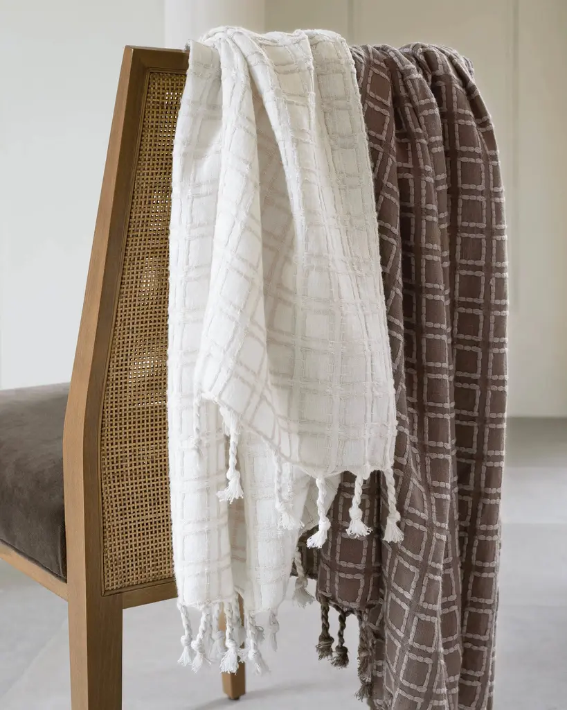 Bold texture meets subtle design. The stitch effect checks bring to mind vintage Japanese weavings – modern, sophisticated, and understated. Savor the soft texture contrasts in this gauzy open weave linen throw. Classic, cozy, and versatile for chilly mornings, power naps, and snuggly evenings on the sofa. A modern sensibility is expressed through traditional craftsmanship by Marie Flanigan, the Architect, Designer, Founder, and Principal of Marie Flanigan Interiors. Part of the Marie Flanigan for Annie Selke collection, a design collaboration that reflects Marie's timeless elegance and innovative simplicity.