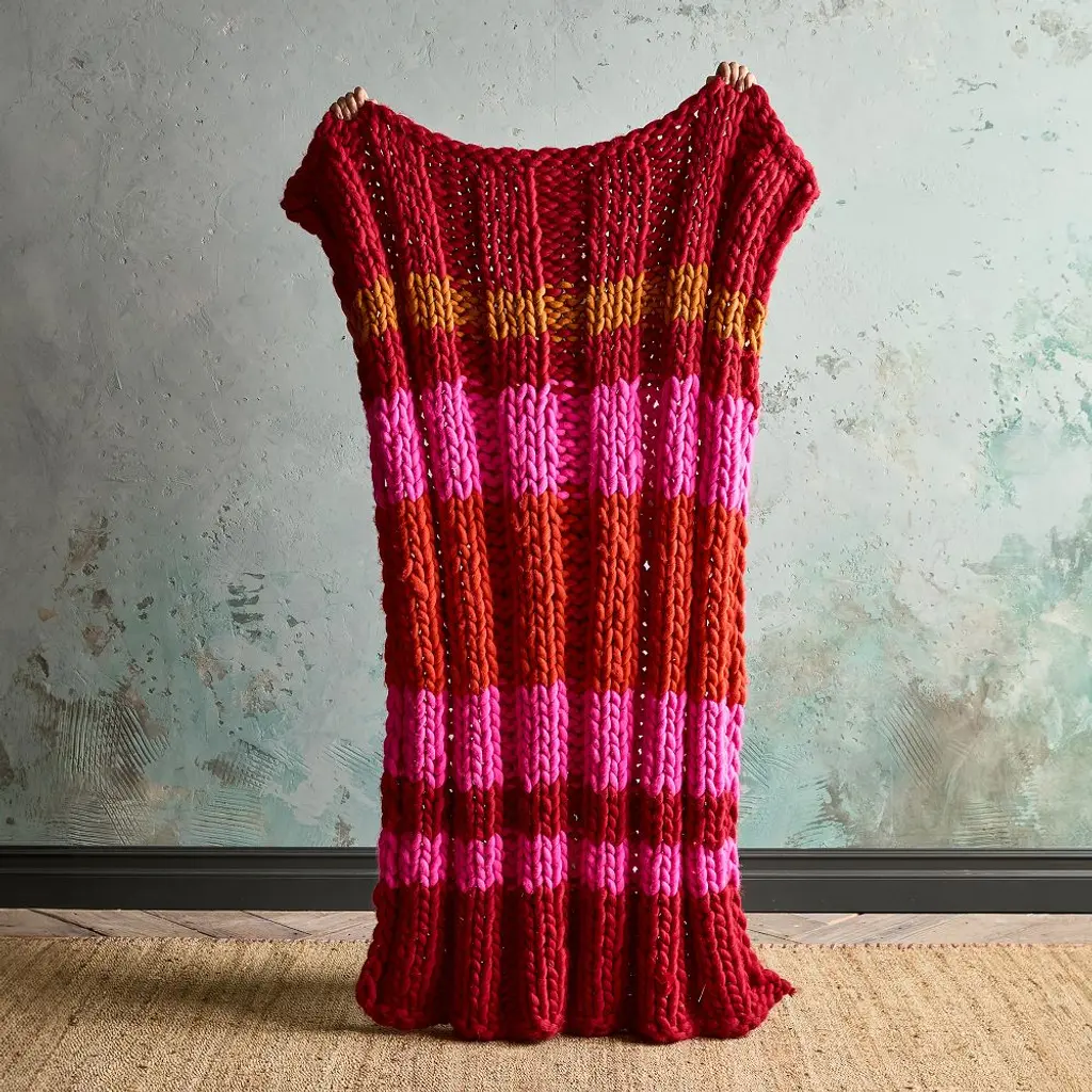 Cue the color. Hand-knit in India, this 100% wool throw brings bright, happy stripes to a sofa, chair, or bed.