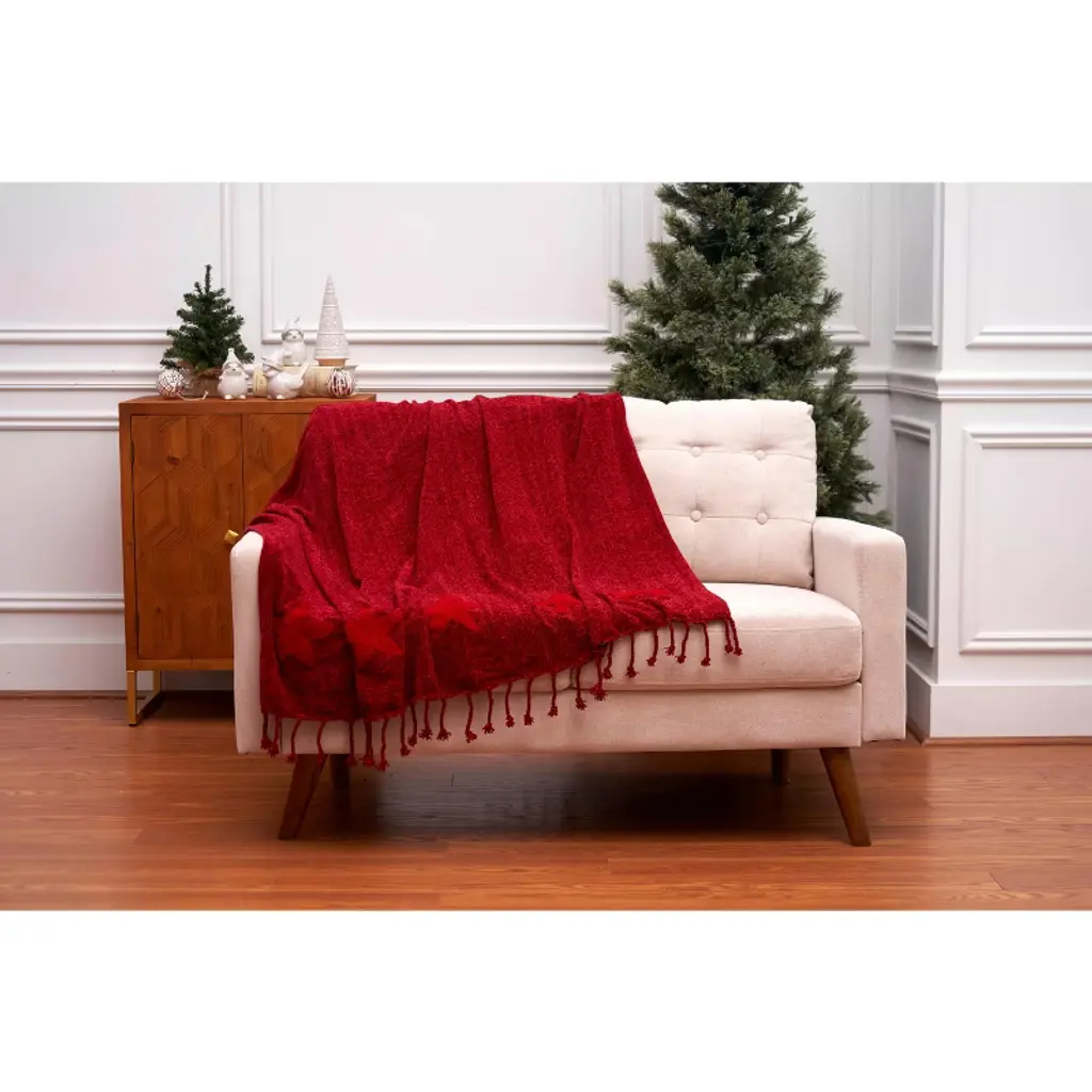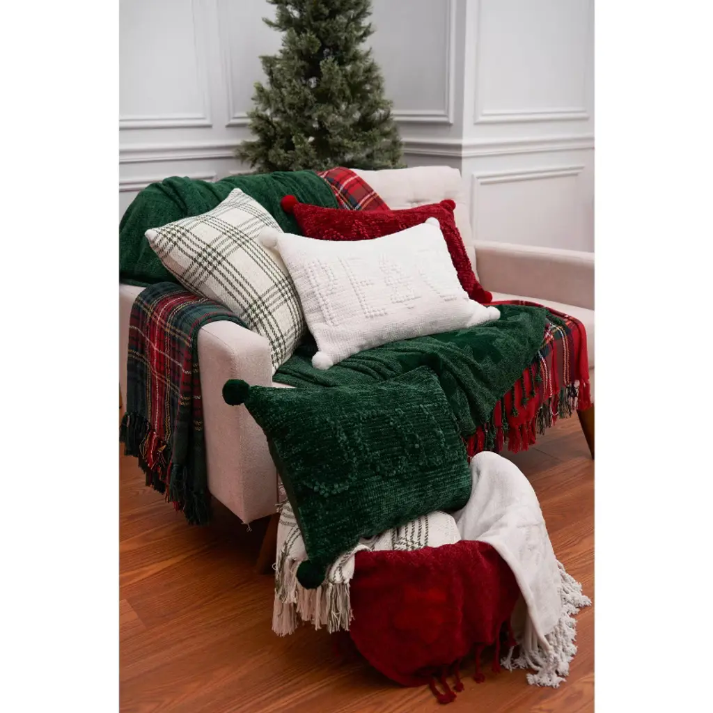 The Solid Tree, Star and Snow Throw Blankets are crafted from soft butter chenille, is a beautiful throw featuring tufted silhouetted iconic designs on a solid backdrop, adding a playful touch to holiday decor. The knotted fringe edges enhance this throw’s charm and provide a delightful texture. Perfect for snuggling up on chilly evenings or draping over a chair, these throws bring a touch of seasonal cheer to any space.