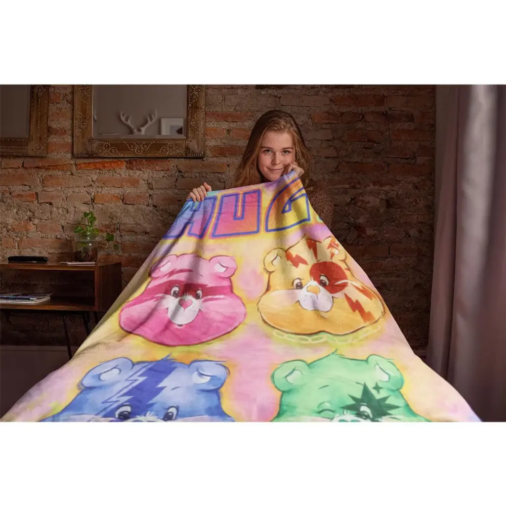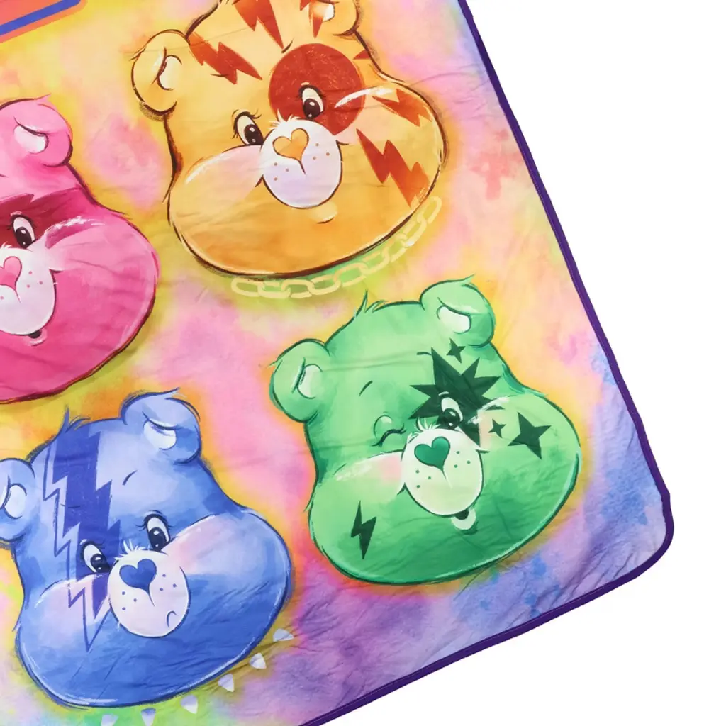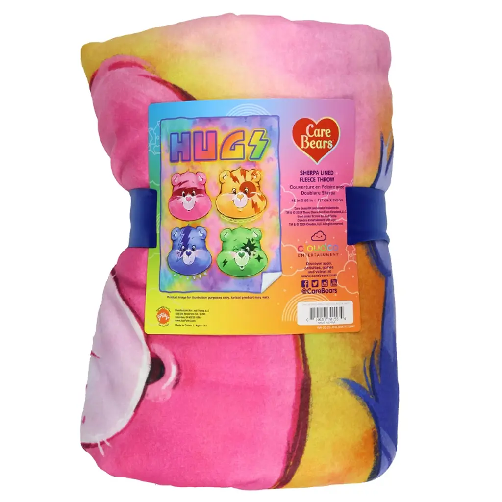 This 45" x 60" fleece throw features a rock-style twist on the classic Care Bears lineup. Grumpy, Funshine, Cheer, and Good Luck Bear are styled with bold band makeup, including stars, lightning bolts, and edgy accessories like gold chains and spiked collars. The word "HUGS" in stylized rock lettering adds to the graphic flair, all set against a vibrant tie-dye background. With a warm fleece lining on the reverse side, the blanket delivers a cozy texture suited for casual use around the house. Care Bears have been a recognizable part of animated history for decades, known for their personalities and positive messaging. This design brings that legacy into a modern, energetic style for fans who enjoy playful design and a nostalgic edge.
