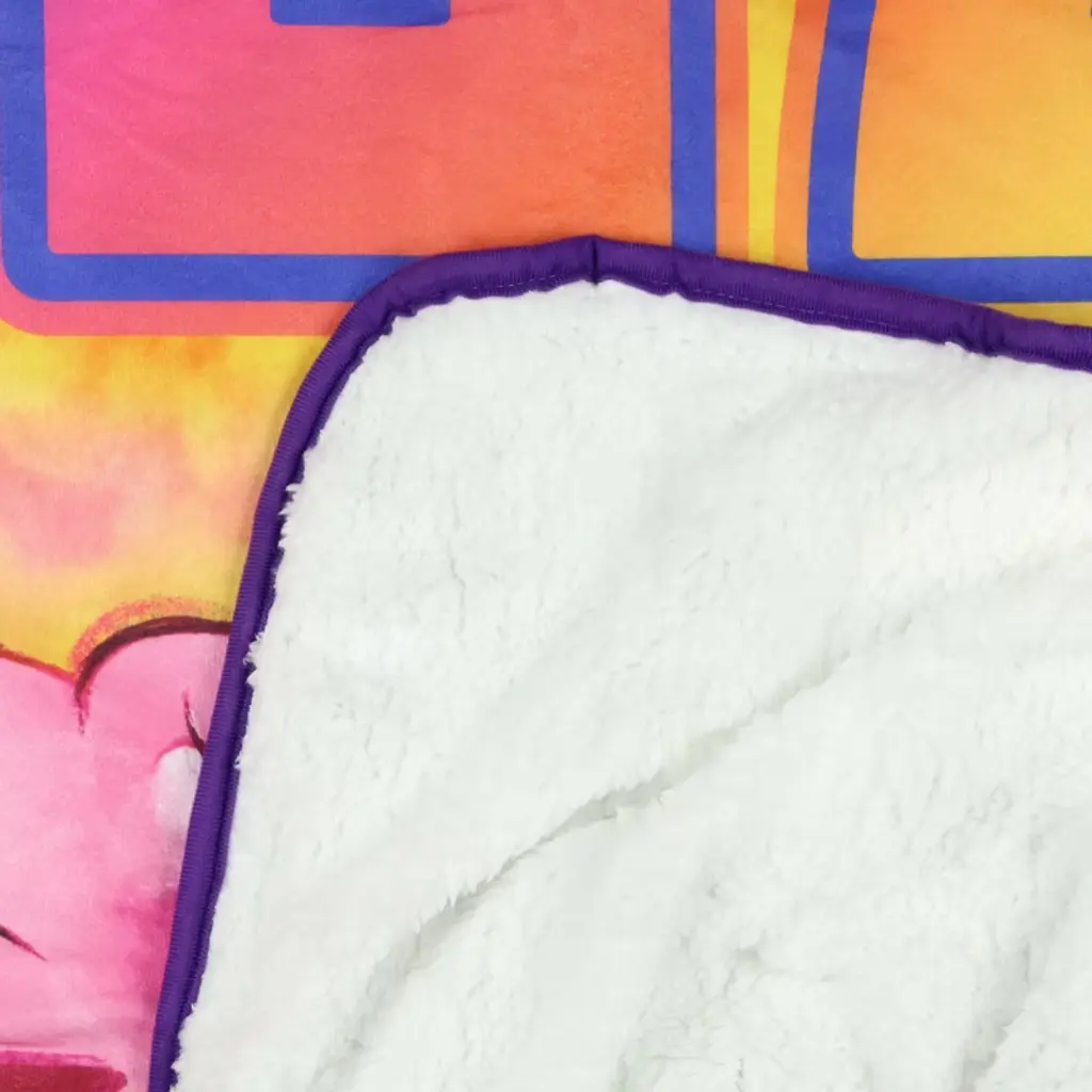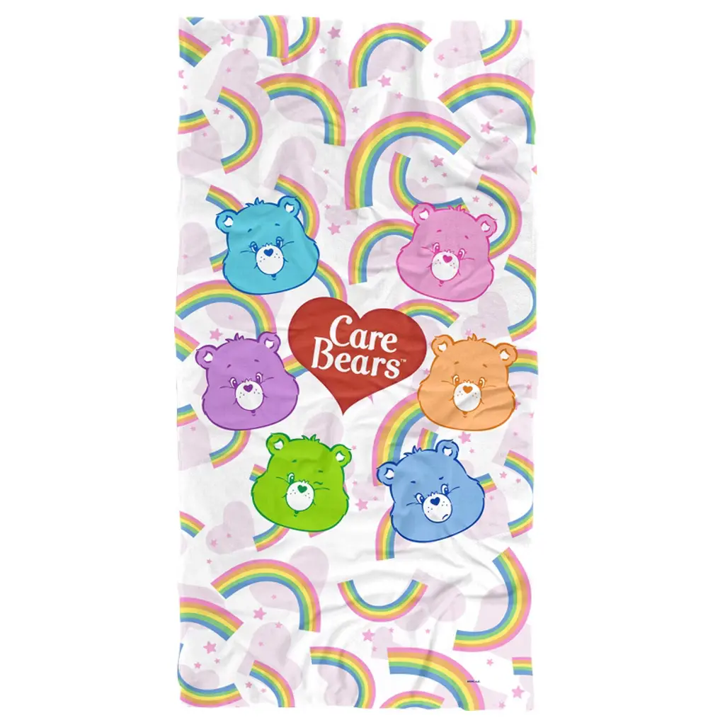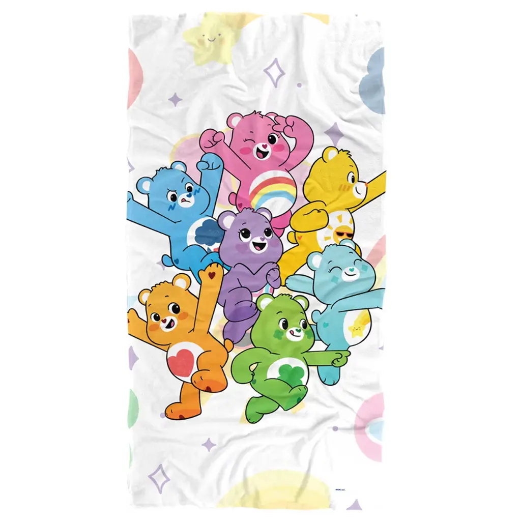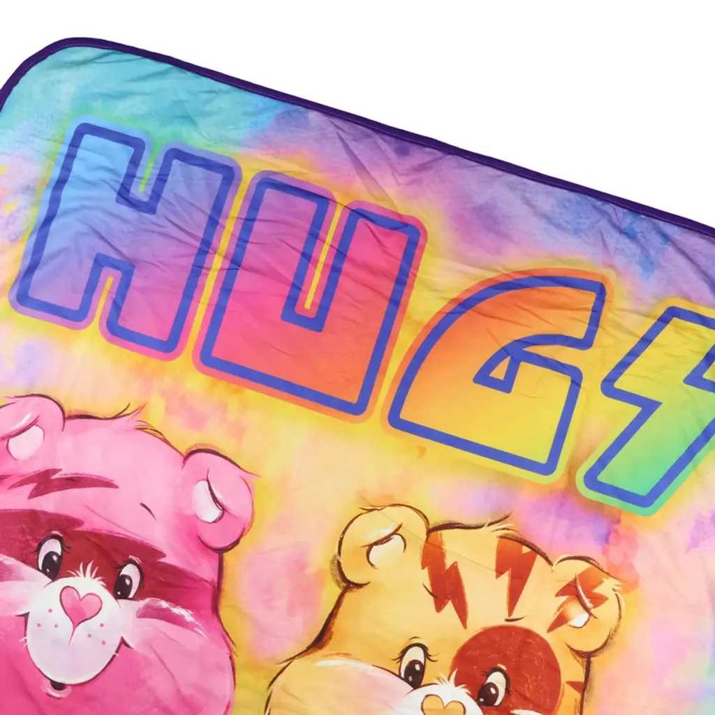 This 45" x 60" fleece throw features a rock-style twist on the classic Care Bears lineup. Grumpy, Funshine, Cheer, and Good Luck Bear are styled with bold band makeup, including stars, lightning bolts, and edgy accessories like gold chains and spiked collars. The word "HUGS" in stylized rock lettering adds to the graphic flair, all set against a vibrant tie-dye background. With a warm fleece lining on the reverse side, the blanket delivers a cozy texture suited for casual use around the house. Care Bears have been a recognizable part of animated history for decades, known for their personalities and positive messaging. This design brings that legacy into a modern, energetic style for fans who enjoy playful design and a nostalgic edge.