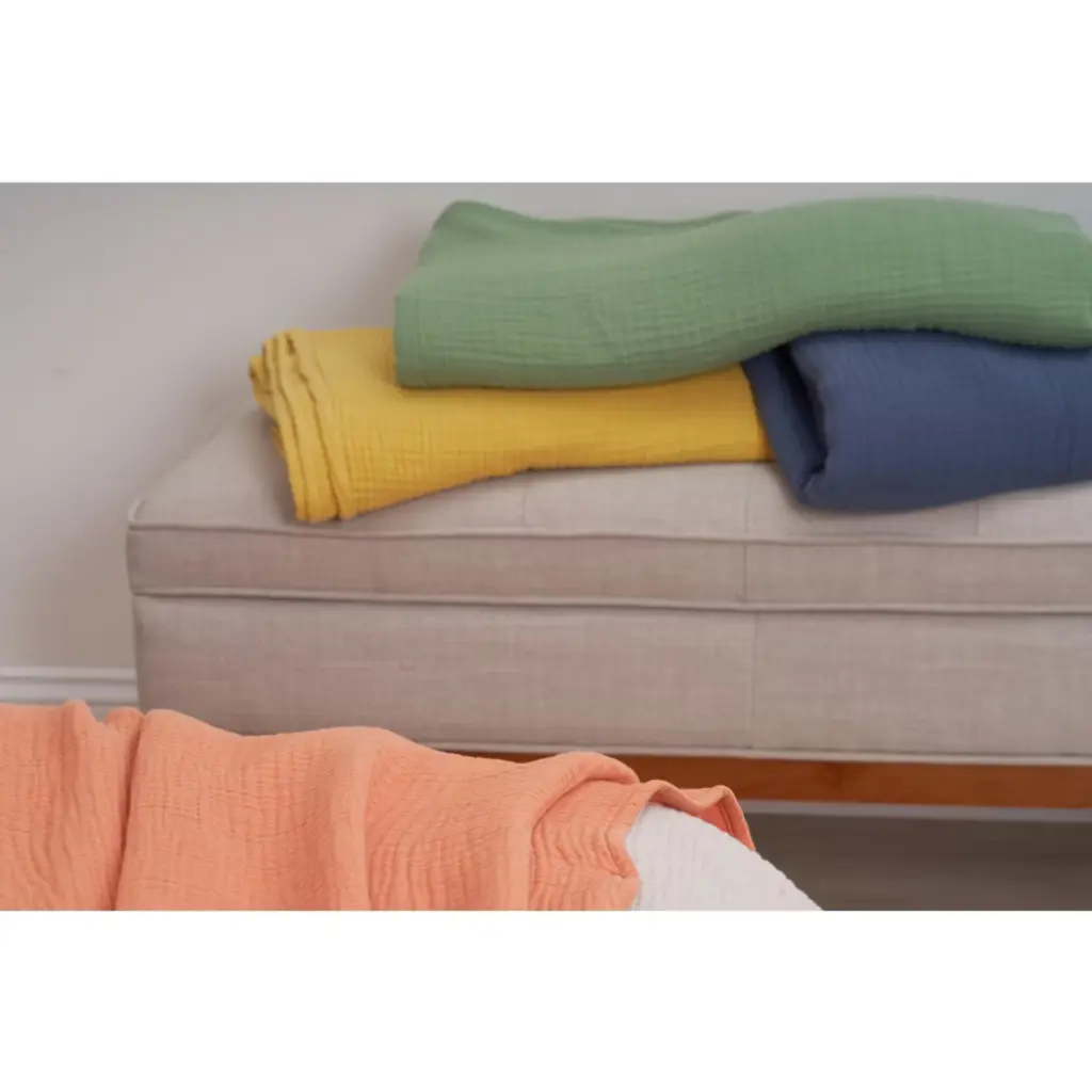 Fashioned from quadruple layered cotton gauze, the Ryker coverlets and throws are designed to make a lasting impression. Offered in a variety of solid hues, including charming vintage indigo, refreshing succulent green, vibrant melon orange, soothing moonbeam grey, and cheerful dandelion yellow, this bedding ensemble exudes timeless elegance. Whether used as a versatile layering element within existing decor or as the centerpiece to elevate a bed arrangement, it seamlessly integrates into any space with the addition of complementary accent pillows.