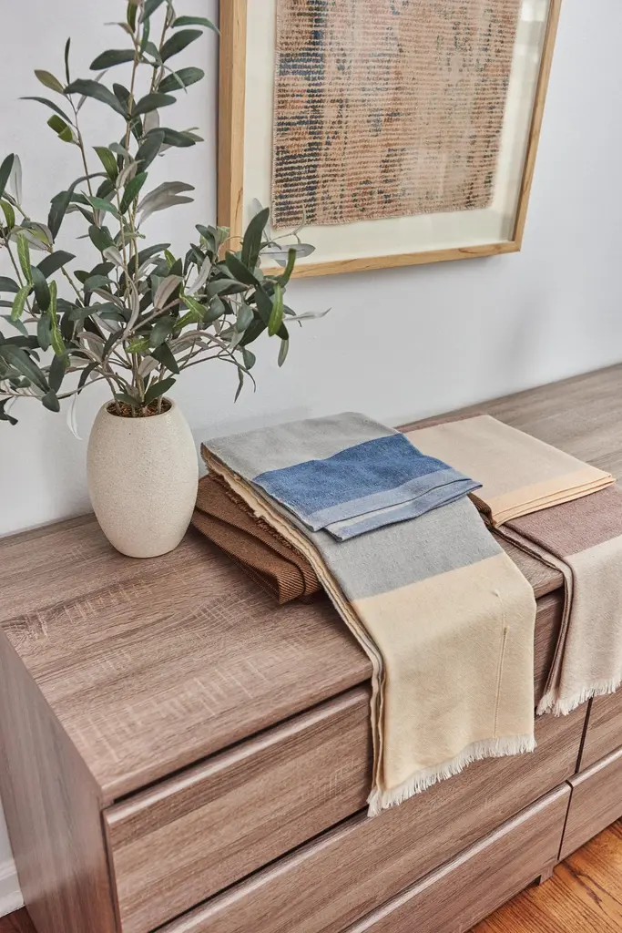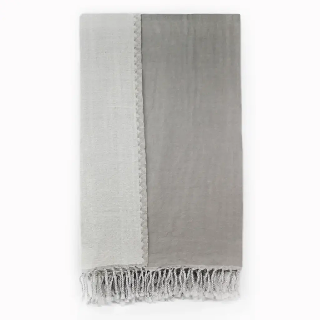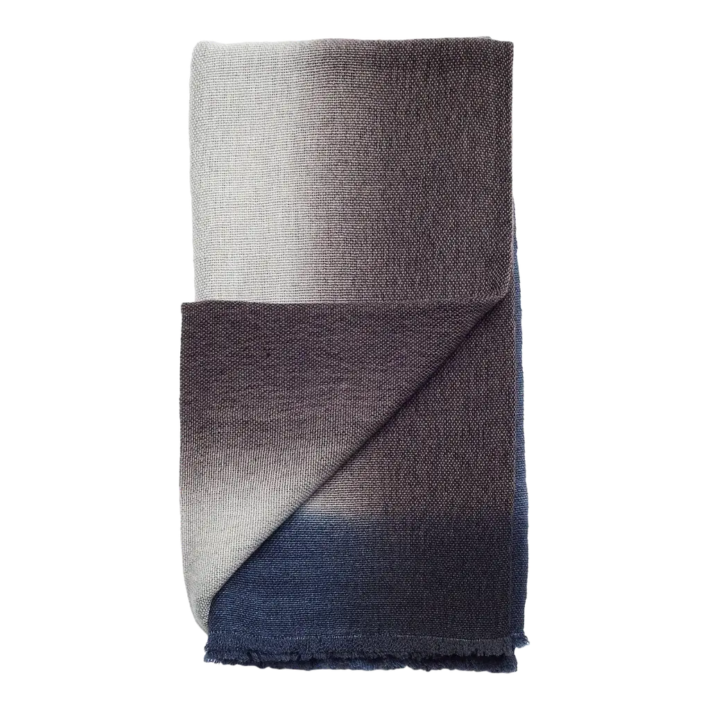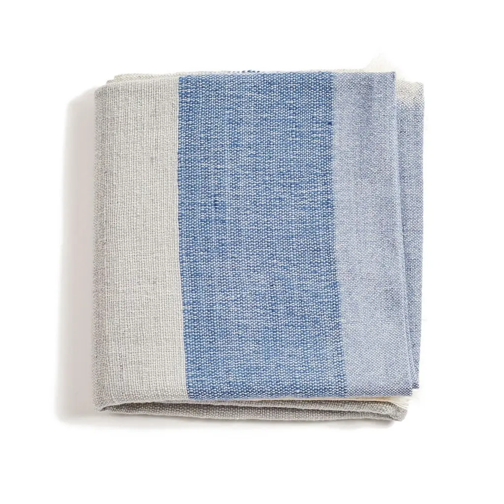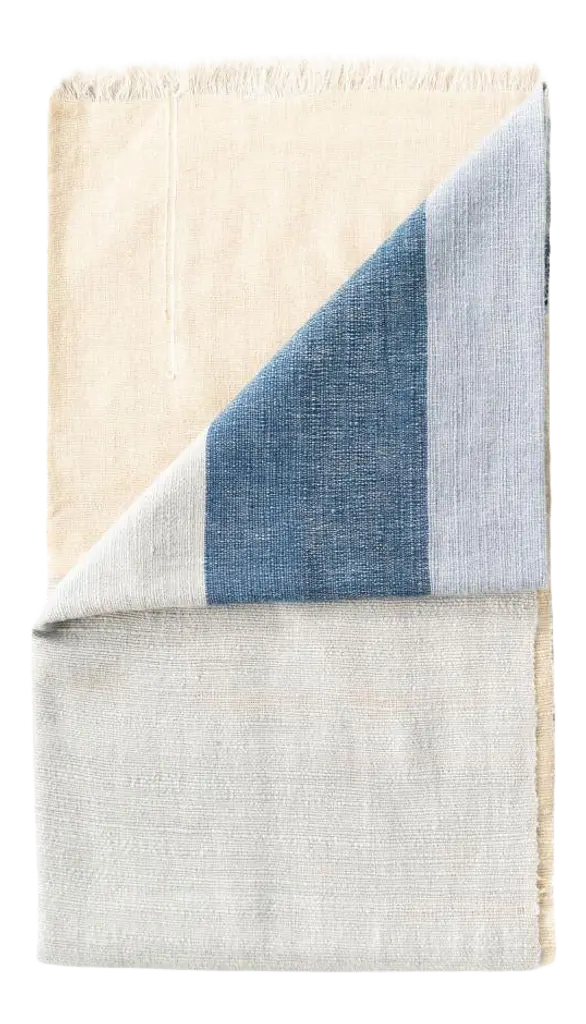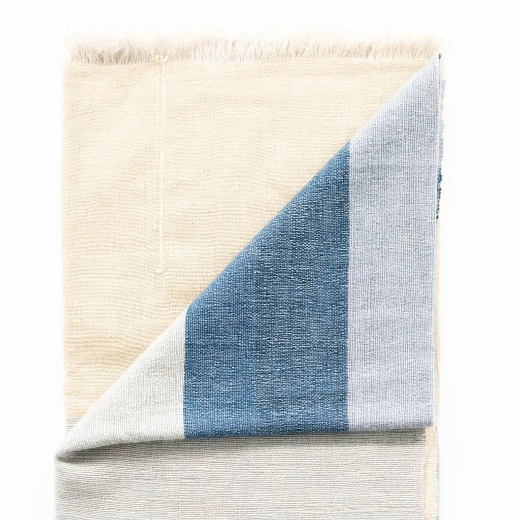 Custom design by Studio Variously, CERU merino throw or blanket is handwoven by master weavers in Nepal.A sustainable design brand based out of Michigan, Studio Variously exclusively collaborates with artisan communities to restore and revive ancient techniques by exploring custom modern designs in textile based products.This textile's design is made up of color block panels in cool shades of cream, shades of grey blue and pop of sombre cerulean blue tones. Each panel has a unique subtle textured hand feel. All the panels are beautifully handwoven together making it stand out as a modern color block design. This piece is also reversible to arrange and use. Our textiles are incredibly soft to touch and wear well over time. There are fine details of hand embroidered details on either side of the handloom throw in subtle colors. Requiring attention to detail and finishing, CERU throw / bedspread / blanket luxuriously combines heritage value and high quality craftsmanship.For CERU we are using only the highest quality of soft natural merino yarn, which is later hand-dyed with certified earth-friendly Swiss dyes, free of toxic chemicals. Our Swiss dyes are certified eco- friendy & specifically engineered to promote the lifespan of each throw. As this luxurious textile is completely handmade from start to finish, each piece is unique. Classic and modern in design, this timeless throw / blanket will enhance interior spaces and also support artisan communities ethically.Size: 79" x 39" (200 cm x 100 cm) (can also be used as bedspread for queen or full sized bed & any size of couch)Material: 100 % premium merino ethically sourced from Australia.Colors: Shades of cream, beige, grey blue and cerulean blue.Origin: Ethically handwoven by master weavers in Nepal.Wash care: Gently hand wash with cold water and hang dry or delicately dry clean only.Packaging: Each throw comes in a square cotton canvas pouch, which allows the textile to breath, and this can be re-used for storage. All our packaging pouches are also made by our artisans to keep our production inclusive.