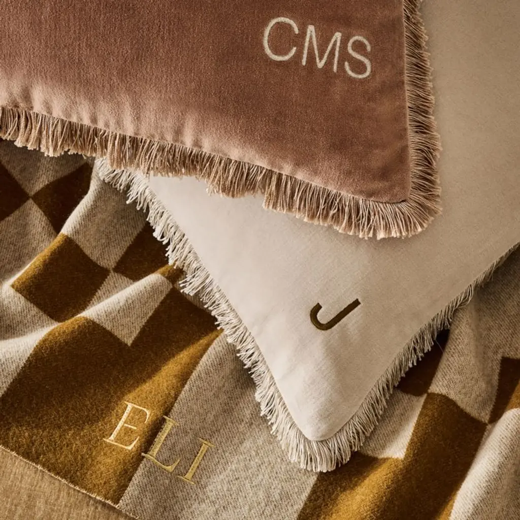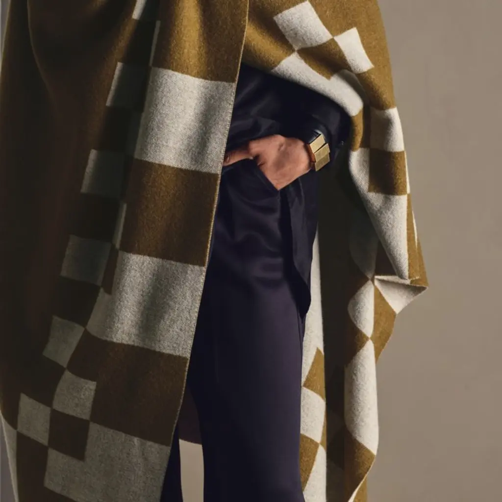 Designed by Molly Fitzpatrick, wool throw blanket makes a bold statement. Crafted of 100% wool for softness and a lightweight drape, its tobacco brown border is a modern take on the classic check pattern. A graphic accent for the bed or sofa. CB2 exclusive.