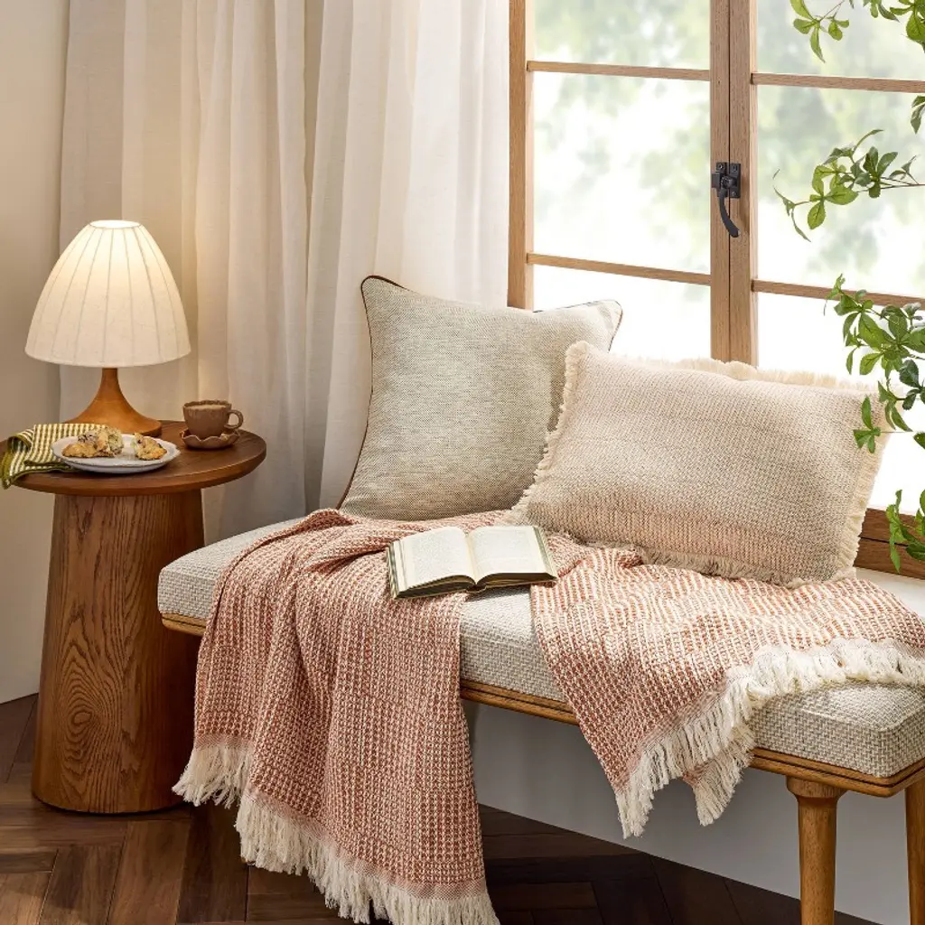 Wrap yourself in luxurious comfort with this Checkered Knit Throw Blanket from Hearth & Hand™ with Magnolia. This throw blanket showcases a checkered knit design in a rusted hue with cream fringed edges for a lovely look that blend effortlessly with any decor style. Made from cotton-linen blend jacquard fabric, this knitted blanket is super soft to touch and perfect for snuggling up while you nap or watch some TV.Hearth & Hand™ with Magnolia: Gather • Create • Enjoy