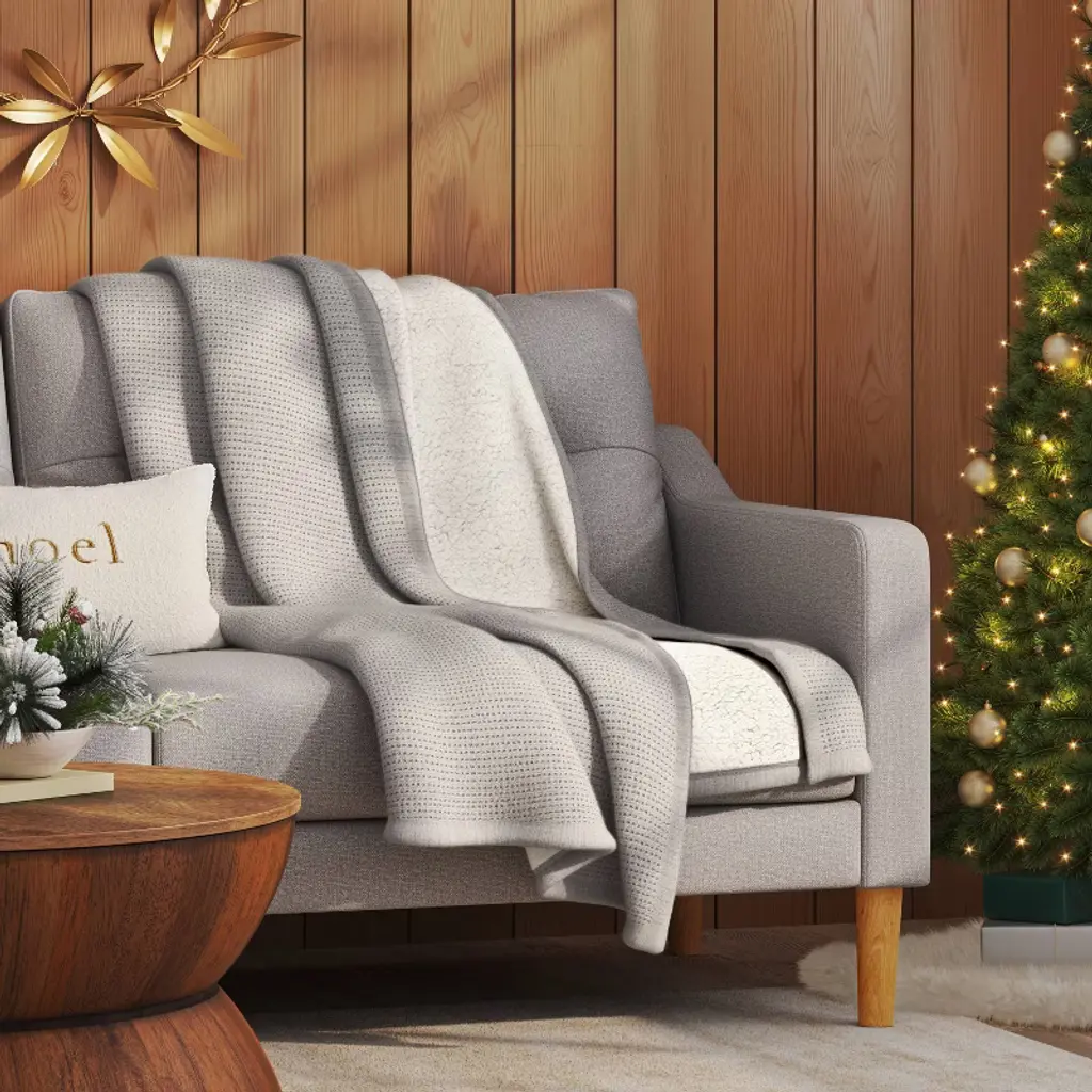 Layer warmth into your living space with this Chenille Knit Throw Blanket with Faux-Shearling Reverse from Threshold™. This rectangular throw blanket measuring 60 by 50 inches showcases a chenille top with waffle-knit texture and a faux-shearling reverse, and it's finished with hemmed edges for a neat look. Made from 100% recycled polyester fabric, the midweight throw blanket is also machine washable for effortless cleaning.Threshold™: Looks like home, feels like you.
