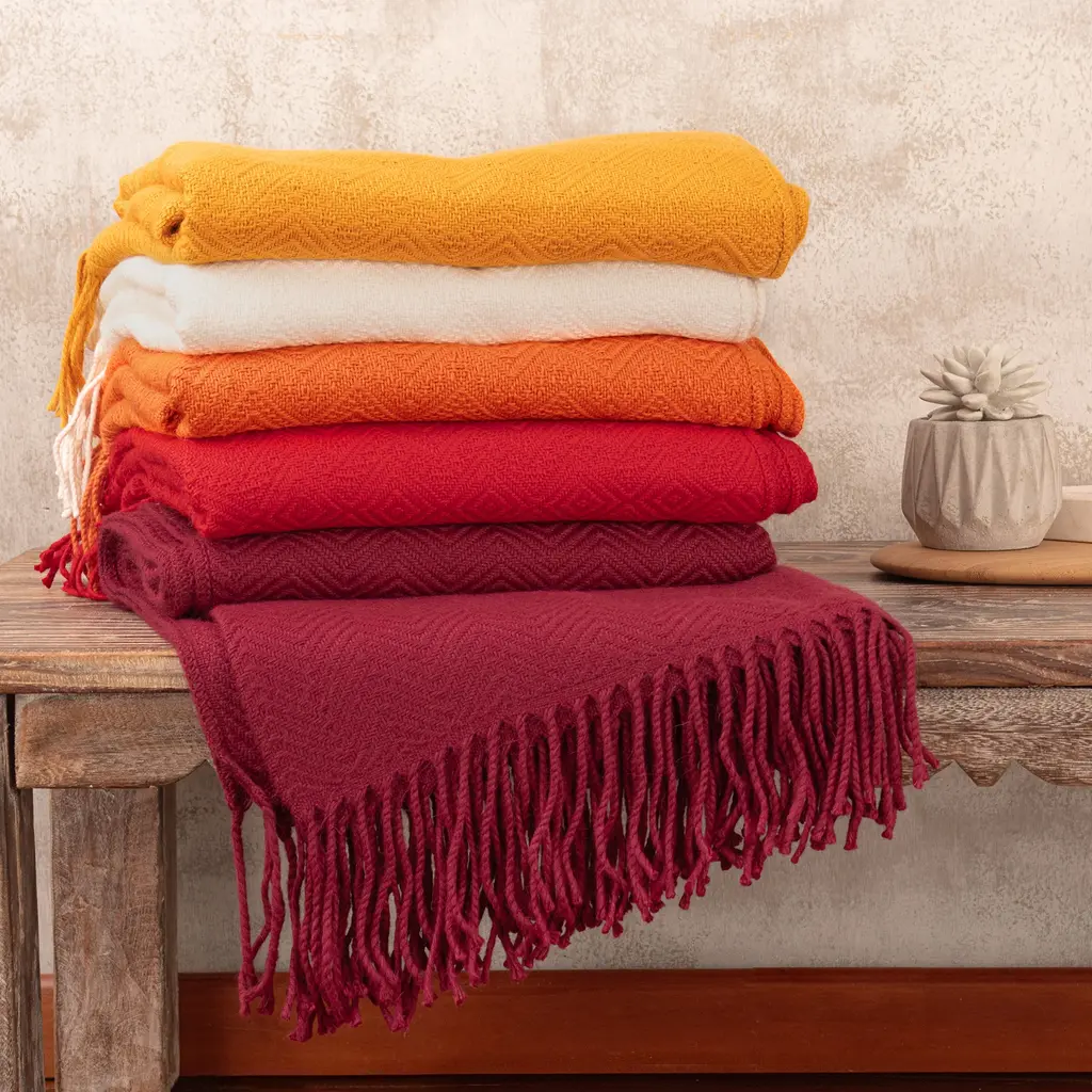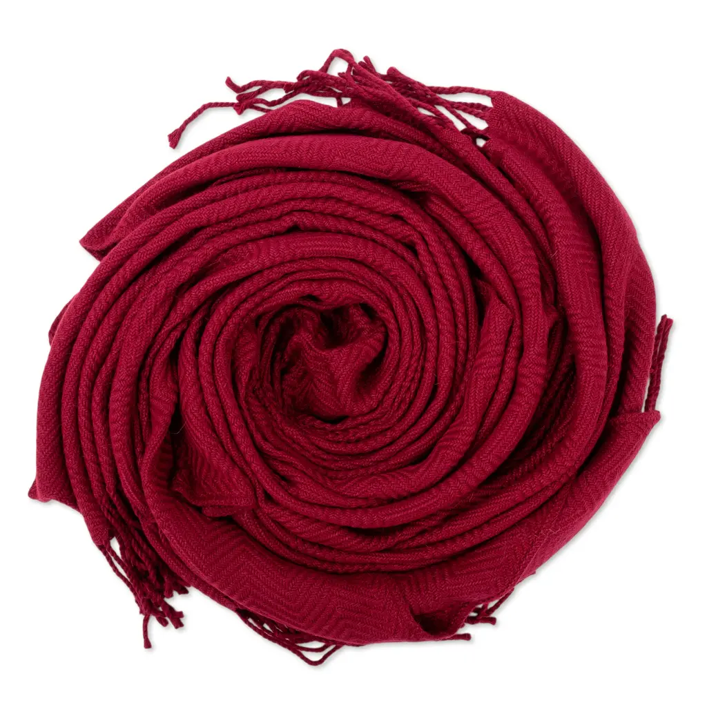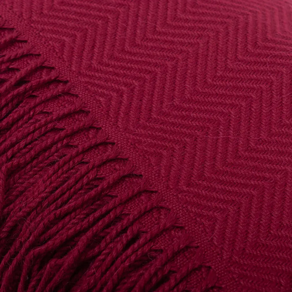 Nestor Yana in Peru creates this elegant throw blanket from a soft blend of acrylic and alpaca wool. The chevron-patterned throw in a rich wine color is accented with long fringe.