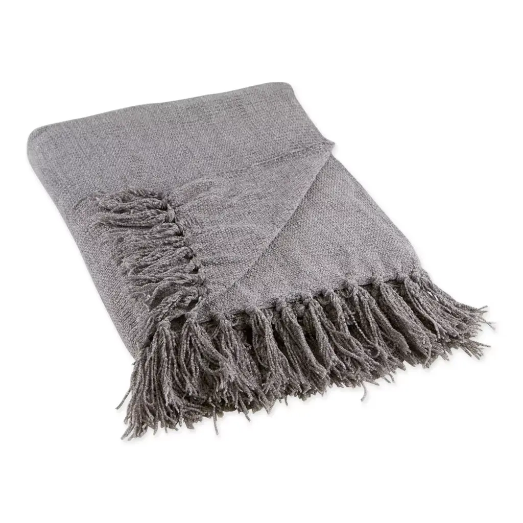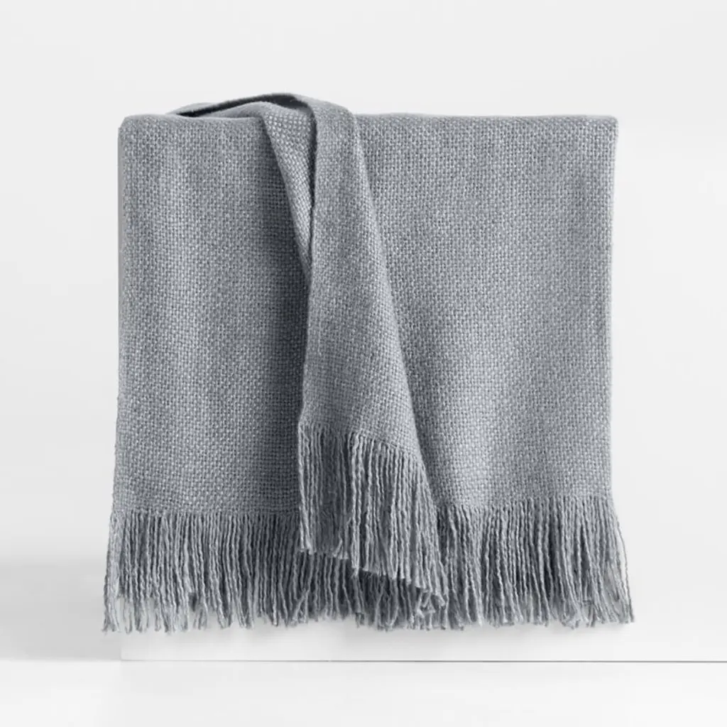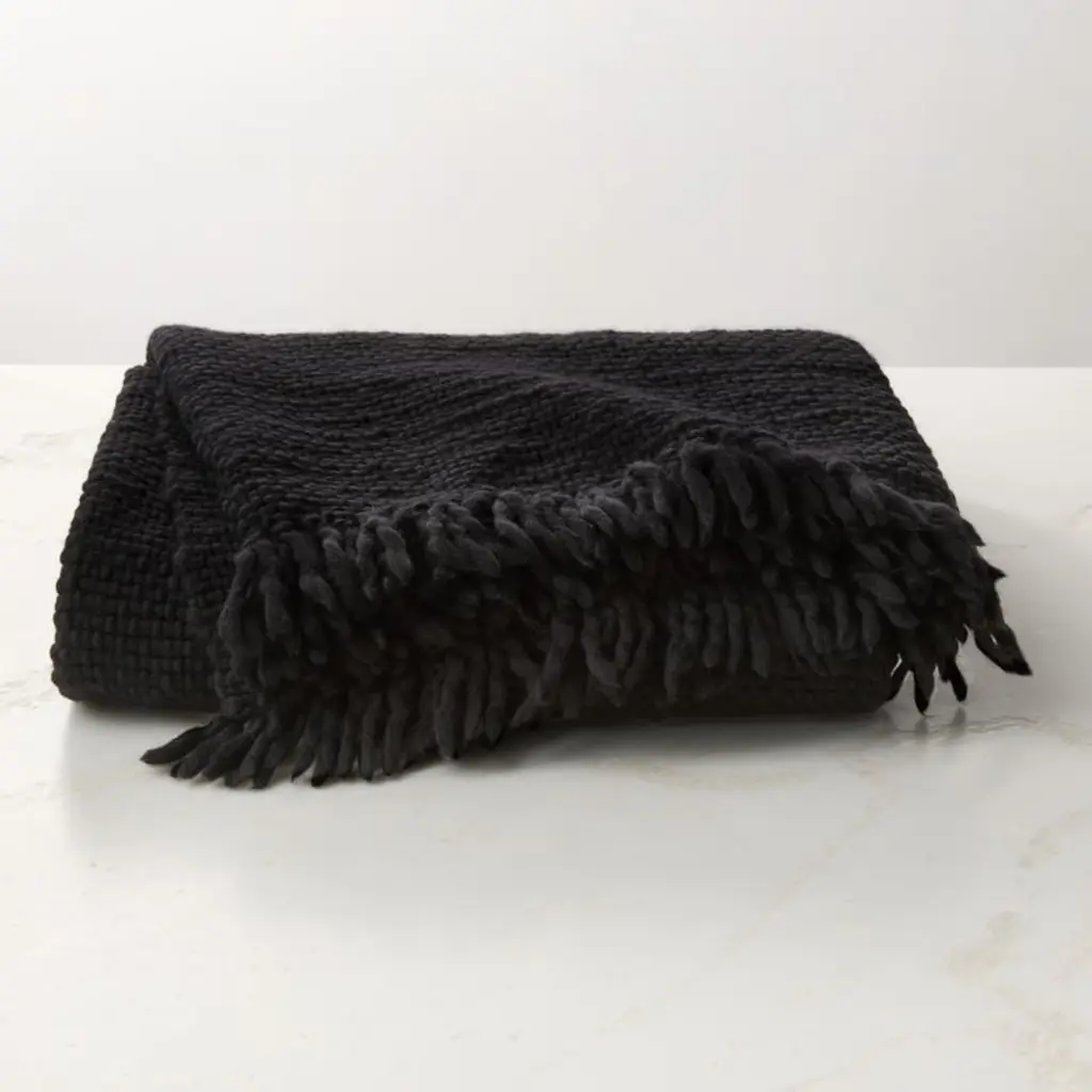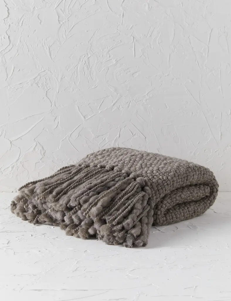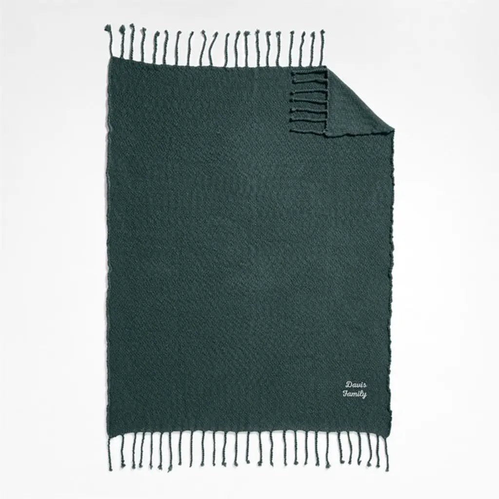 Our spruce green throw couldn't get cozier. Knit of yarn-dyed wool with a hint of acrylic, the supersoft throw blanket rivals a handknit heirloom with chunky stockinette stitching on one side, garter on the other. Long fringe is braided and knotted to further enhance this throw blanket's rustic appeal.