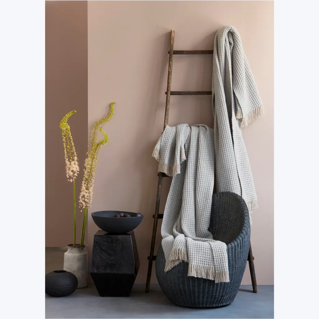 The Cleo Cashmere Throw embodies pure indulgence, making it the most luxurious piece in our collection. Crafted in the United Kingdom from 100% cashmere, this throw offers unparalleled softness and warmth. A special washing technique enhances its loft and texture, creating a supremely cozy and inviting feel.Featuring an understated basketweave pattern and delicate combed fringe, Cleo’s monochromatic design exudes timeless elegance. Available in two serene shades, Cloud and Pearl, it seamlessly complements both modern and traditional interiors. Perfect for draping over a sofa or layering on a bed, this throw adds a touch of refined sophistication to any space. Wrap yourself in the ultimate comfort and style with the Cleo Cashmere Throw — an heirloom-quality piece designed to elevate your home.