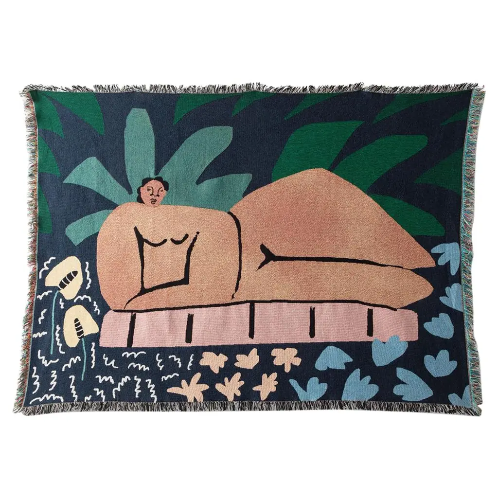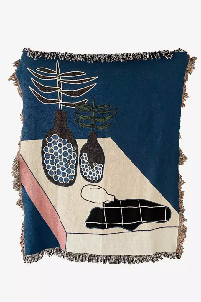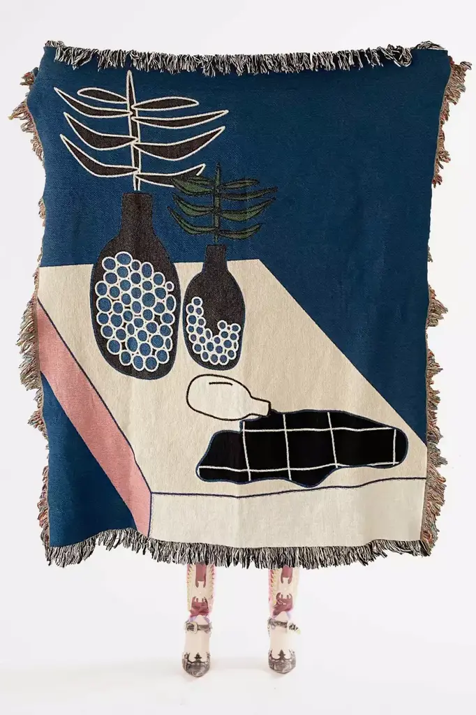 **Please note that all sales are final.** Reunion Woven Throw Blanket featuring a surreal design of a table scape. All blankets are made to order. **Content + Care:** \- 100% Cotton - for breathability & durability \- Embroidered Design \- Finished with Multi-Colored Braided Fringe Ends \- Machine wash in cold water using mild detergent and gentle cycle only. Do not bleach or tumble dry. \- Colors may vary slightly from the image online due to natural variation in thread and screen settings. \- USA **Size:** \- Small (37x52in) \- Medium (50x60in) \- Large (60x80in)