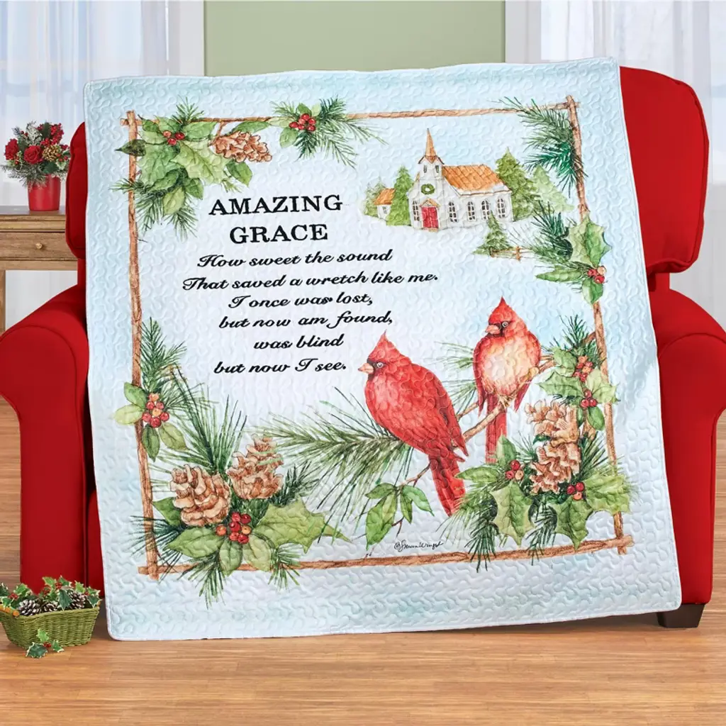 Perfect For The Season, This Beautiful Quilted Throw Showcases A Lovely Design By ©Susan Winget. Featuring A Winter Scene With A Church And Cardinals Perched Nearby, It's Finished With A Holly And Pine Border And All-Over Quilted Texture And A Verse From Amazing Grace. Machine Wash. Polyester; Imported. 59"L X 48"W.