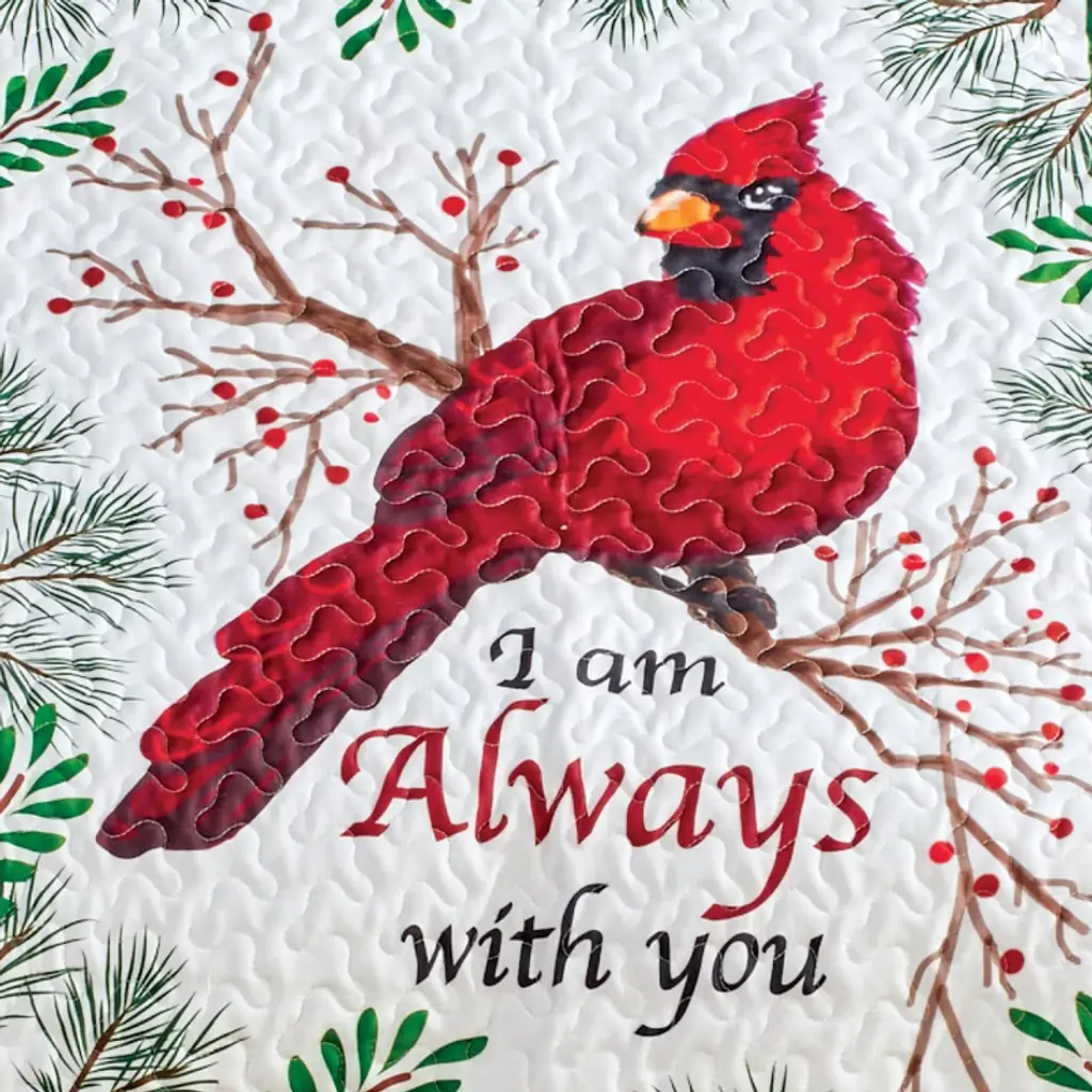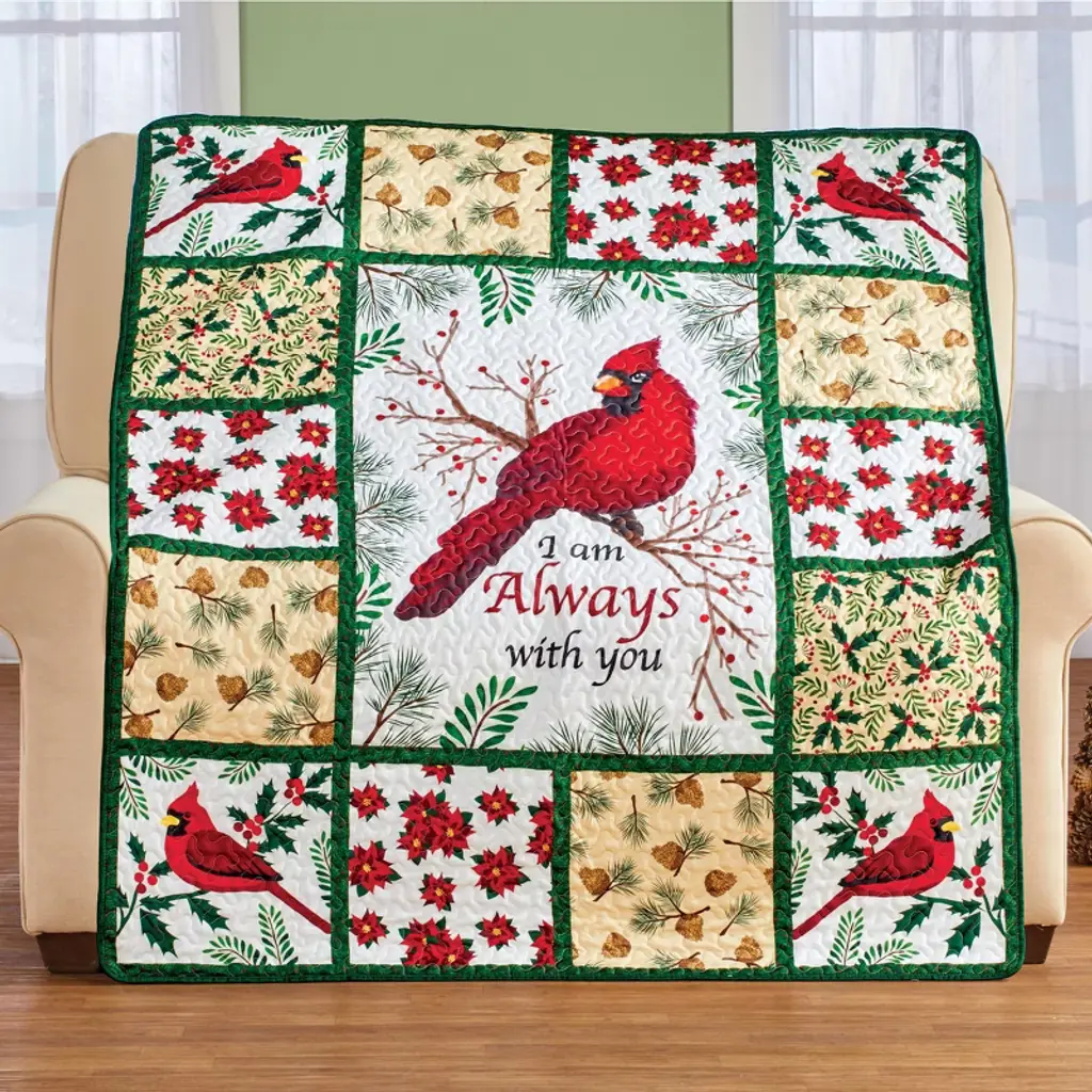 This Quilted Throw Is A Beautiful Reminder That Someone Special Is Always With You. The Center Design Features A Bright Red Cardinal Sitting Atop A Branch With Red Berries And Evergreens. The Detailed Patches Feature Holly, Poinsettias, Pinecones And A Cardinal Appears In Each Corner. It Has An All-Over Quilted Texture And Is Trimmed In Green. Machine Wash. Polyester; Imported. 60"L X 50"W.