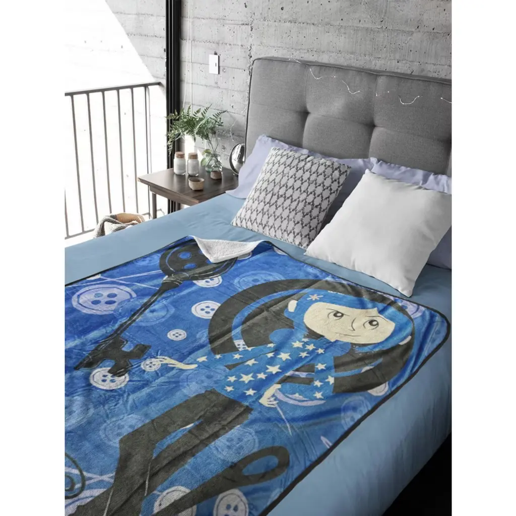 This Coraline throw is a cozy and lightweight companion featuring a cool all-over button pattern with a key and dragonfly details inspired by the story. Made from soft, silky polyester, it’s warm without feeling heavy, and the 46" by 60" size gives you plenty of room to snuggle up on the couch, add a comfy layer to your bed, or take it along on trips. It’s also super easy to care for—toss it in the washing machine on a gentle cycle and tumble dry on low. The fabric stays soft and the design looks great wash after wash. Whether you’re a fan of Coraline or want a unique and comfy throw, this blanket is a great choice to keep around for everyday comfort.