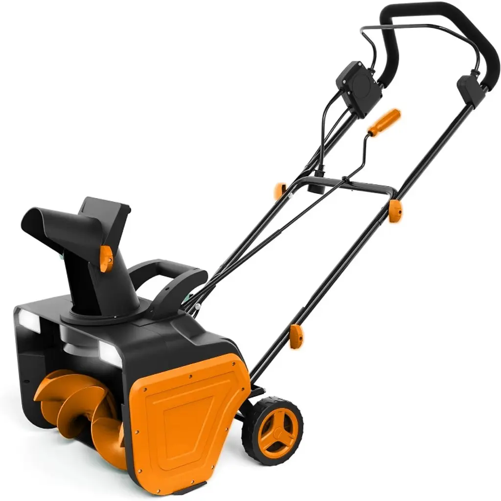 Tired of clearing your driveway with family by shoveling? Our electric snow thrower would be worth considering. Compared to traditional tools, the snow blower features 15Amp motor providing longer and efficient working performance, which can throw snow up to 30ft. In addition, our snow thrower is easy to cut a full 20-inch wide by 10-inch deep swath of snow with each pass. 180°rotatable chute allows you to freely change snow throwing direction and you can loosen the locking knobs to adjust chute deflector to change the height of the snow stream. And the snow thrower is designed with safe button to prevent accidental starting. All in all, this high performance electric snow blower is an ideal choice for clearing snow in your yard, porch, driveways, walkways, and other public places. FeatureMove up to 20" width and 10”height snow in one pass 8" Wear-resistant auger blade can quickly clear snow Powerful motor makes it easier to throw snow up to 30ft 180° chute rotation changes the direction of the snow stream freely Adjustable chute deflector is convenient to change snow height sturdy PP material and solid steel account for reliable structure Comes with 2 flexible wheels for easy mobility Switch button starts for safe and hassle-free operation Ergonomic handle for comfortable use experience 2 bright LED lights for better visibility for nighttime snow removal Ideal for walkways, patio, driveways, and other residential areasSpecificationColor: Blue Material: PP, Steel, Copper, Rubber Overall Dimension: 20" x 38.5" x 40" (L x W x H) Voltage: 120V, 60Hz Rated Power: 15A No Load Speed: 2,900 rpm Working Height: 10" Working Width: 20" Throwing Distance: 30ft Auger Diameter: 8" Snow Discharge Angle Range: 15°- 60° Net Weight: 30 lbs Package Includes: 1 x Electric Snow Thrower 1 x User Guide