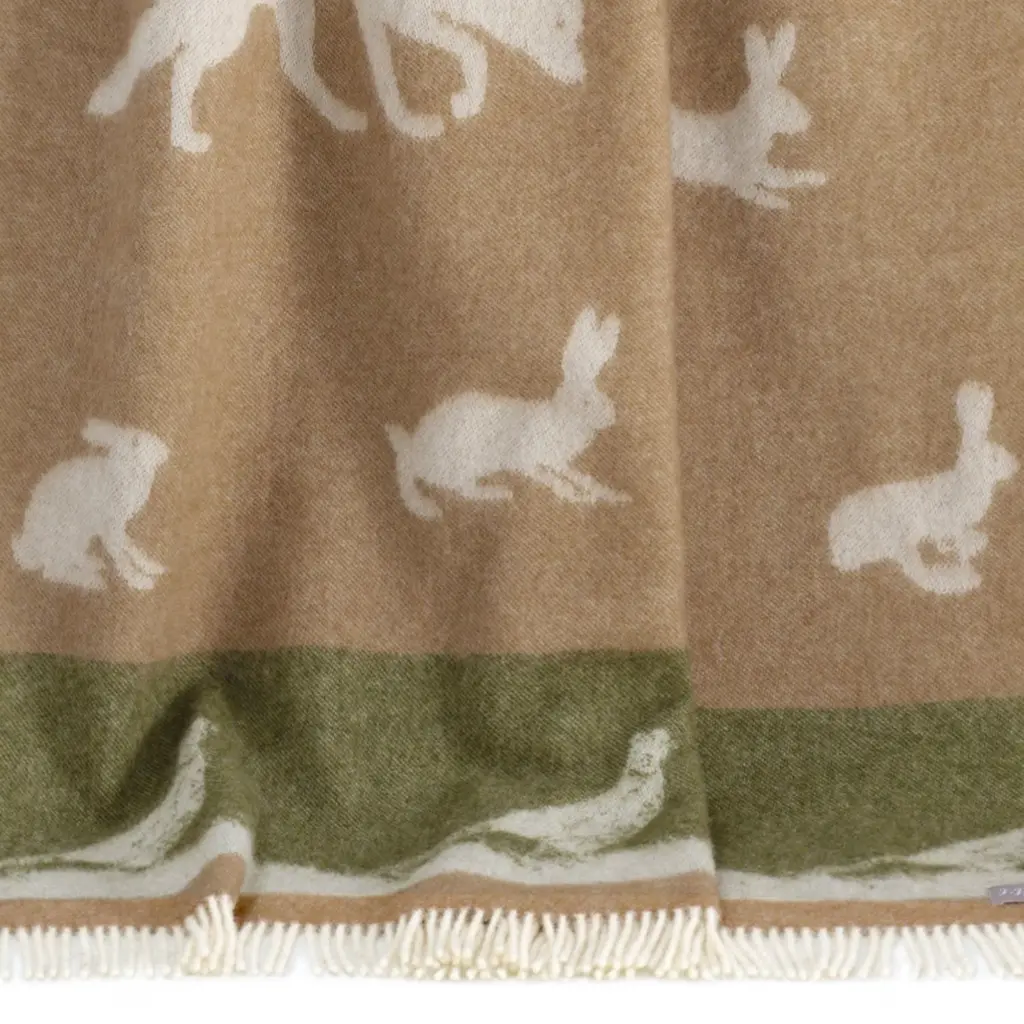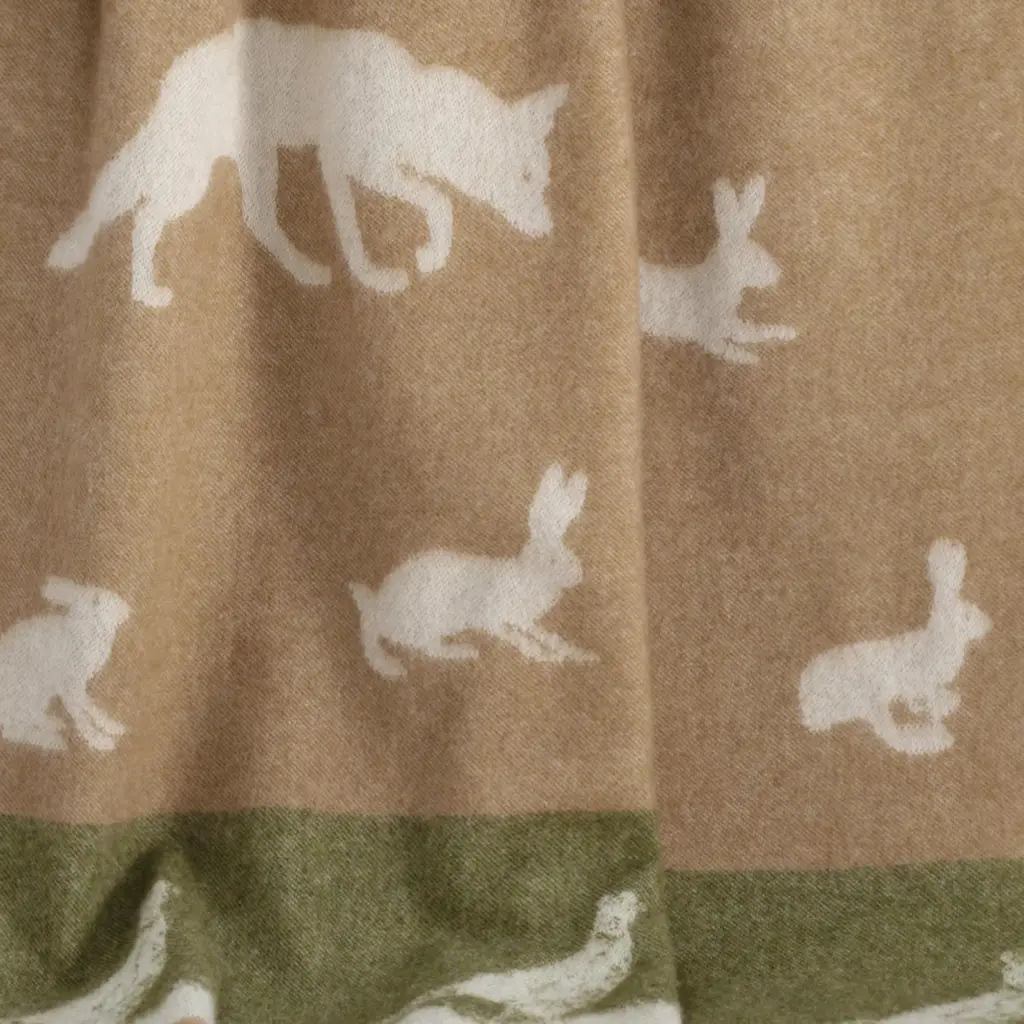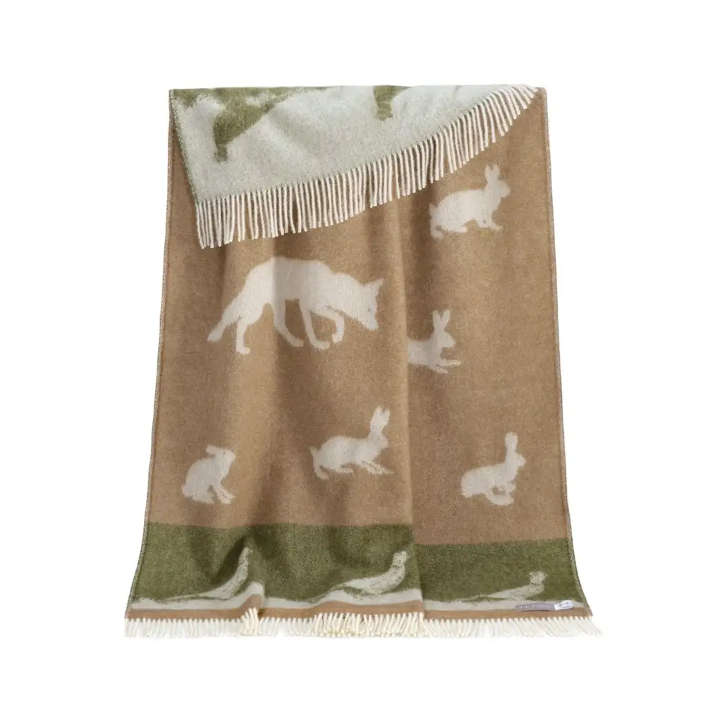 Rediscover the charm of the countryside with our Country Throw, an updated remake of our archived Rabbit Throw. This piece is adorned with a classic array of animals typically found in the British countryside —foxes, hares and pheasant—set against a rich colour scheme of earthy brown and lush green. Woven from pure wool and finished with a wool fringe, its design is fully reversible, featuring the inverted colour scheme on the reverse. Perfect for cosy evenings in or as a stylish rustic accent in your living spaces.