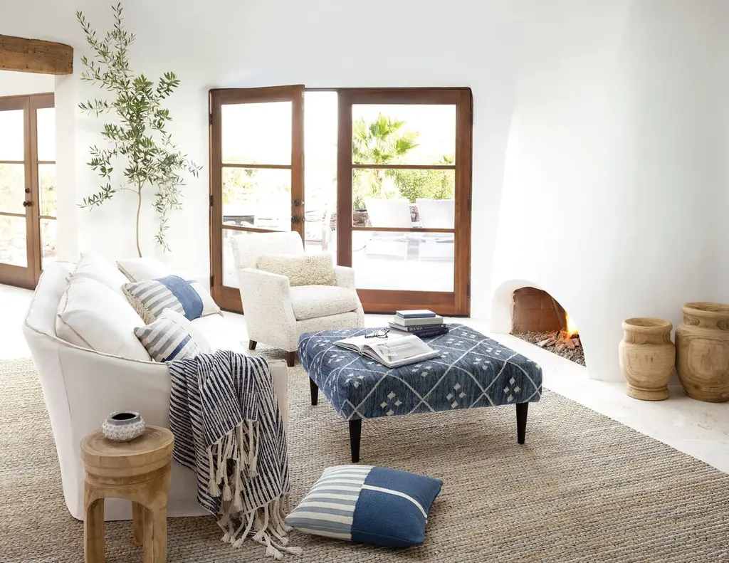 Navy-blue stripes are stitched onto the white ground of this handwoven cotton throw. Six-inch-long braided fringe adds to the artisanal allure.
