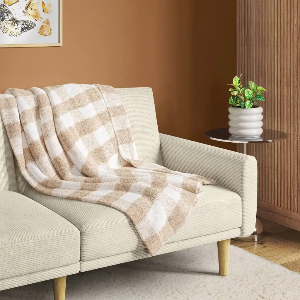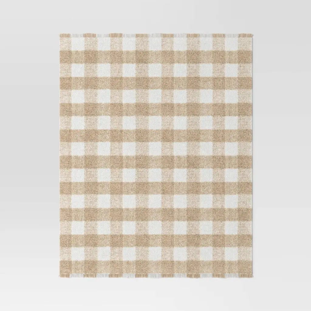 Layer your favorite chair or couch with the inviting colors and warmth of this Cozy Woven Check Throw from Room Essentials™. Made from 100% recycled polyester fabric, this woven throw blanket helps keep you nice and cozy. Featuring a checkered print in neutral and ivory hues with a fringed hem, this decorative throw instantly enlivens the look and feel of your living space. Room Essentials™: Everyday Value
