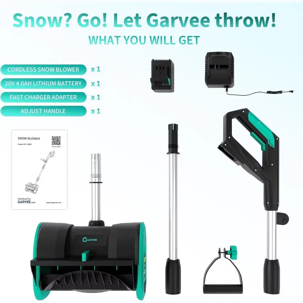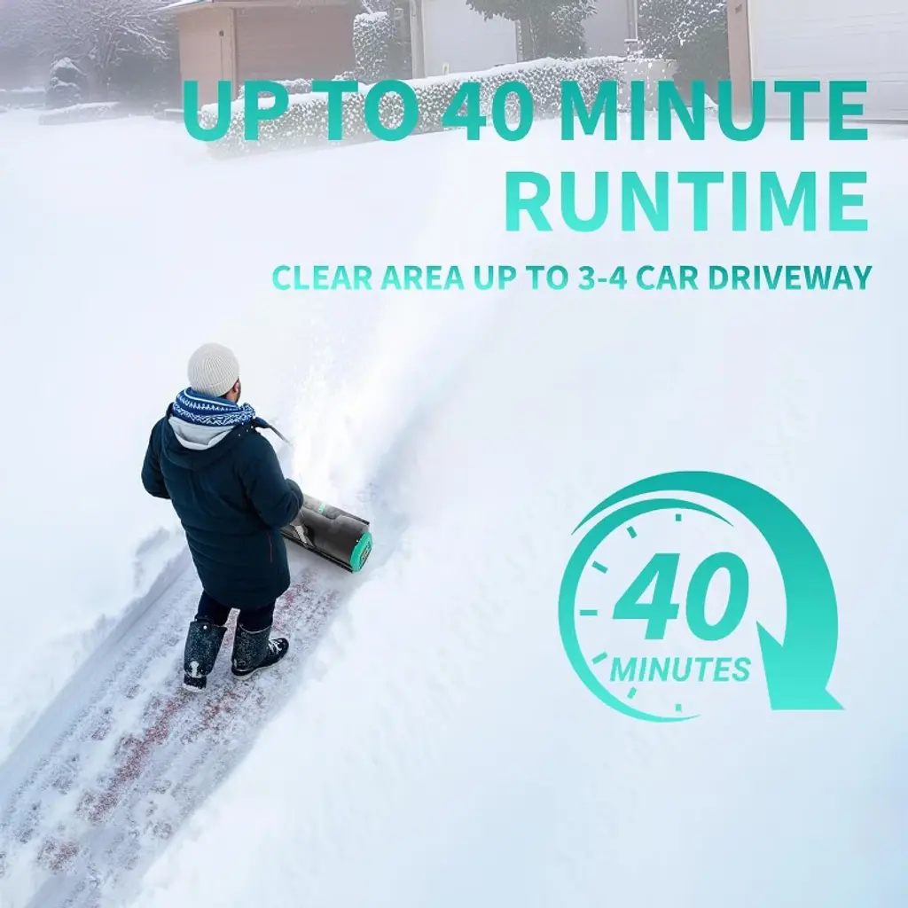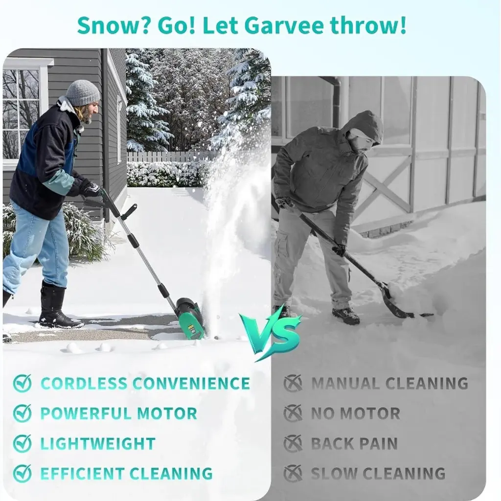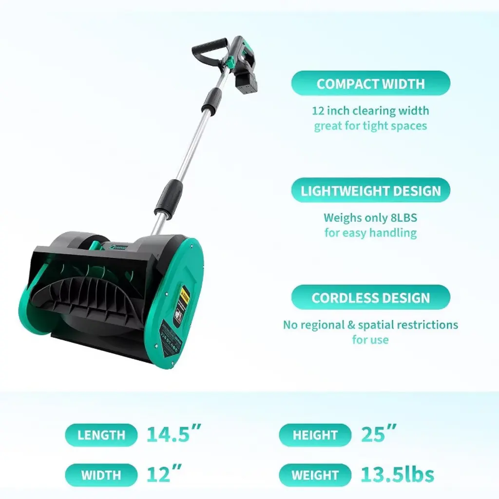 Your ultimate solution for quick, effortless snow removal. Powered by a robust 20V motor and a high-capacity 4.0Ah lithium battery, this snow shovel delivers up to 30 minutes of continuous use on a single charge, allowing you to clear steps, decks, driveways, walkways, and patios without any restrictions or cords. The 12-inch wide by 6-inch deep clearing path ensures you can tackle serious snow buildup efficiently in just one pass.Weighing only 8 lbs with the battery, this lightweight snow blower is designed to minimize back strain and fatigue. The adjustable-angle handle and rotating snow deflector, which can be positioned within a 30-degree range, give you full control over snow direction for comfortable, precise operation. The battery capacity display function keeps you informed about remaining power, so you can plan your snow clearing without interruptions.Its detachable design allows for easy storage during off-seasons, and the zero-maintenance build means you can rely on it anytime snow falls. Specially engineered for agility, this snow blower excels in tight spaces, including stairs and narrow paths, making it perfect for clearing light, fluffy snow quickly and quietly.Key Features:- Lithium battery power for true freedom and instant starts- 12-inch wide by 6-inch deep clearing path for efficient snow removal- Powerful 20V motor with 4.0Ah battery provides up to 30 minutes runtime- Lightweight at only 8 lbs for easy handling and reduced back strain- Adjustable handle and rotating snow deflector (+/- 30°) for comfortable use and precise snow direction- Battery capacity display keeps you informed of remaining power- Detachable design for compact storage and zero maintenance- Ideal for stairs, decks, driveways, walkways, and patios- Quiet operation for a more pleasant snow clearing experience