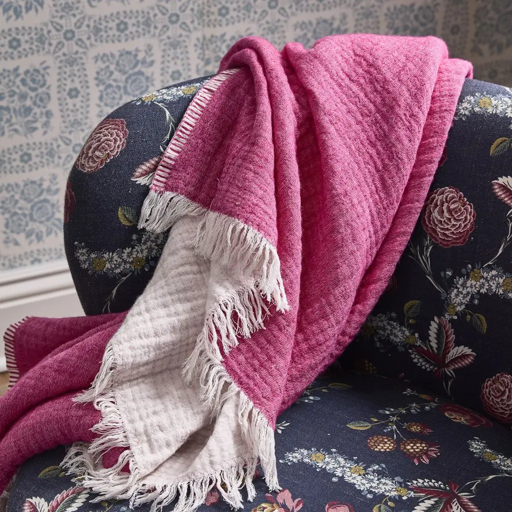 Three textures in one. Merino wool, cotton, and bamboo are woven together to create a crinkled, reversible throw with a soft, fringed edge. A lasting layer for a sofa, chair, or bed.