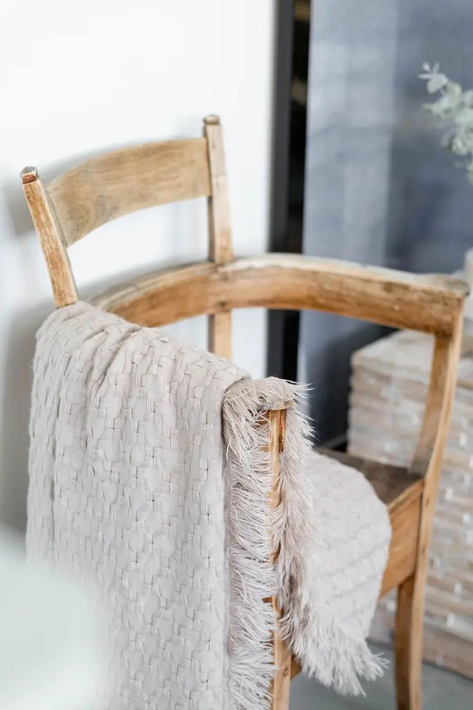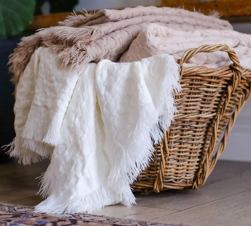 Cozy up in the Delphine with a good book for a moment of relaxation on your couch. It features a subtle basket weave pattern and frayed edges. 100% Acrylic.