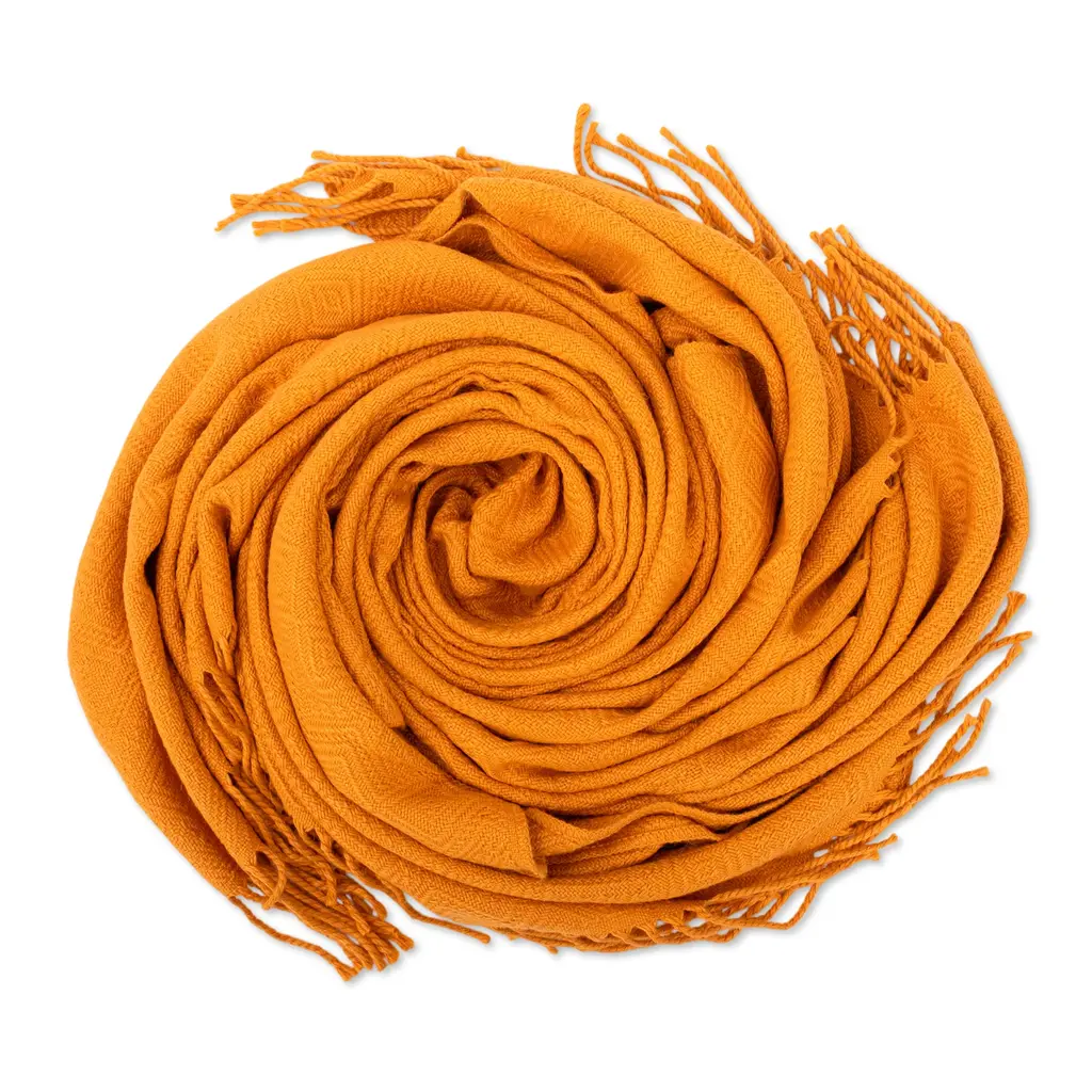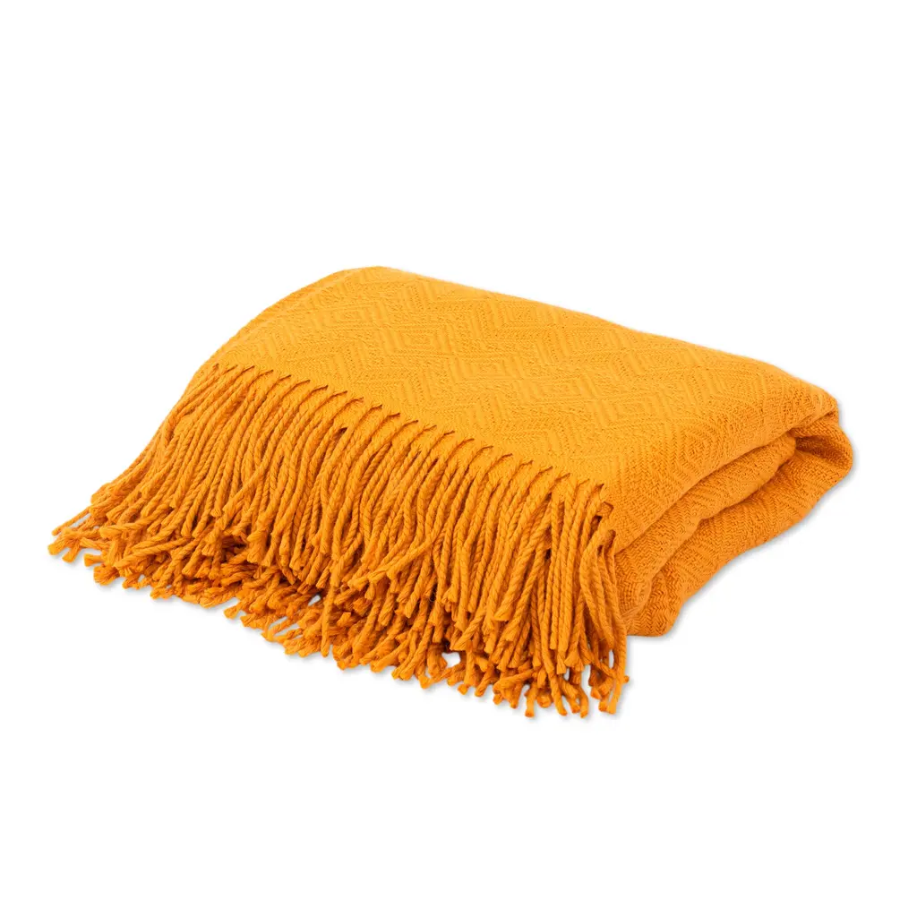 Peru's Nestor Yana creates this elegant throw blanket from a soft blend of acrylic and alpaca wool. The diamond-patterned throw in a honey gold color is accented with long fringe.