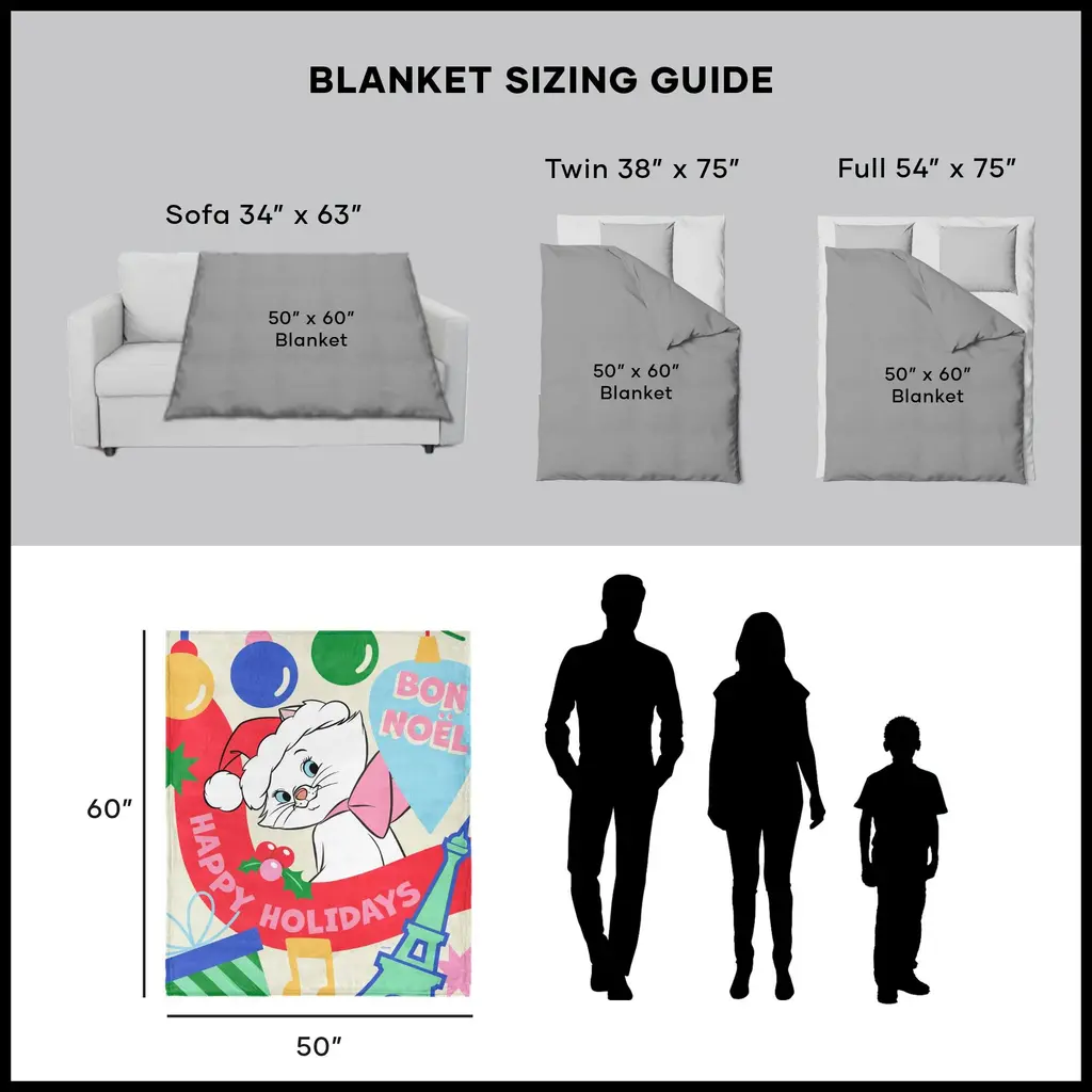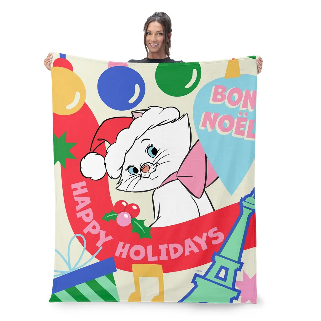 Wrap up in holiday cheer with the Disney Aristocats "Bon Noel" Silk Touch Sherpa Throw Blanket. Featuring the sweet and sophisticated Marie, this blanket is all about spreading festive joy. With her adorable pose and "Happy Holidays" message, Marie makes every moment feel magical. A vibrant holiday-themed background enhances the blanket's charm, filled with seasonal colors and playful details. Whether draped over a couch or used for cozying up, it's a delightful way to enjoy winter nights. The soft and silky texture makes it perfect for snuggling on chilly evenings. This blanket isn't just cute, it's also practical. Lightweight yet warm, it's great for holiday movie marathons or as an extra layer during winter.Features: