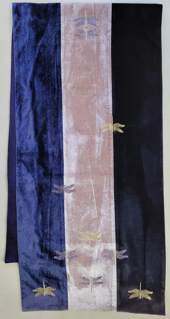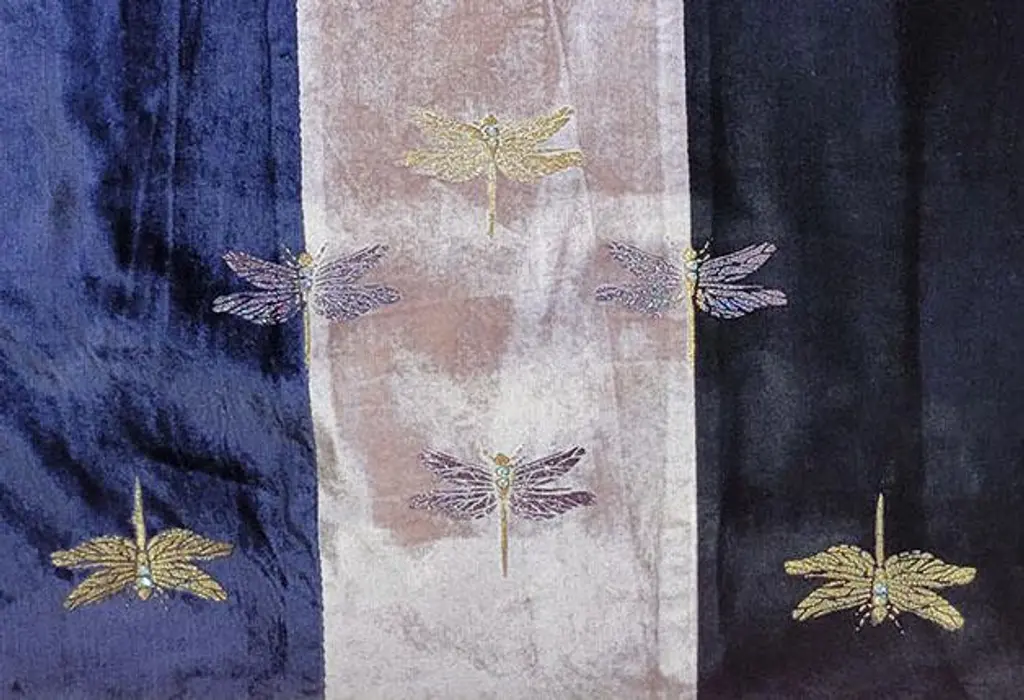 Via Venezia Textiles" extravagant pieces reflect a brilliant infusion of hand-dyed and hand-painted colors and designs that come crashing through every piece with old world and modern charm, while cultivating chic connoisseurship based on ancient motifs and architectural designs from around the world. Via Venezia Textiles features hand-dyed silk velvets and linens that have been created using illustrated wooden blocks, which in turn have been carved and painted entirely by hand to adorn pillows, throws, bedspreads, and haute wearables. The final result is a one-of-a-kind masterpiece of Venetian artistry that is fit for a palace, creating a style like none other for each of its collectors. The studio will come as close as possible to the requested size and color. Any variation will be due to the custom nature of the paint mixture, size of the blocks, and to avoid any compromise in the design. Pillows are made with a zippered closure and are shipped flat. We will gladly recommend insert manufacturers. This pattern is inspired by the dragonfly, a symbol of transformation, affirmation and freedom, and is embellished with Swarovski crystals and gold finishes.