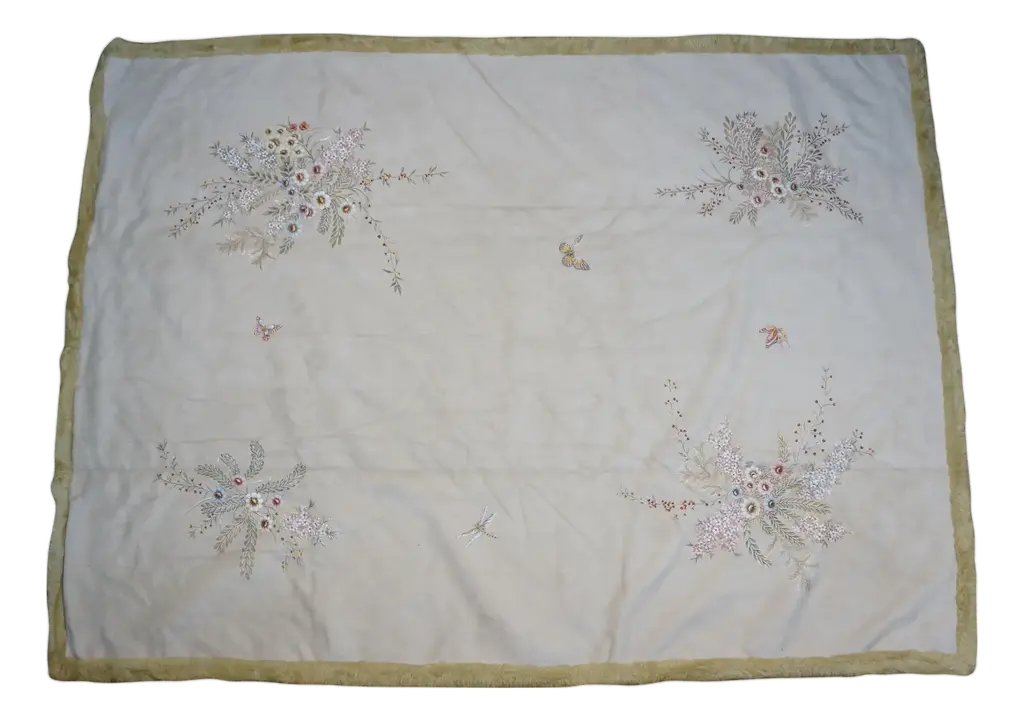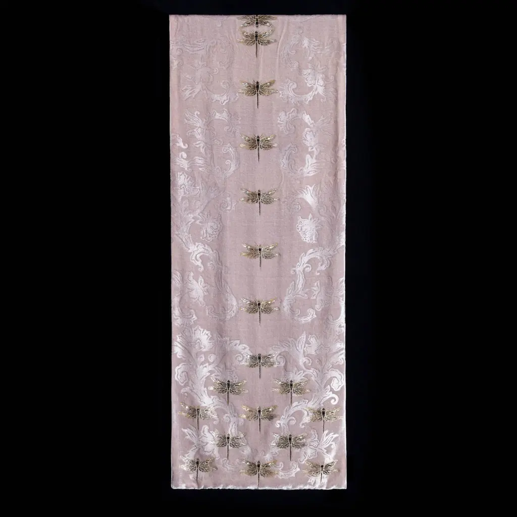 Via Venezia Textiles" extravagant pieces reflect a brilliant infusion of hand-dyed and hand-painted colors and designs that come crashing through every piece with old world and modern charm, while cultivating chic connoisseurship based on ancient motifs and architectural designs from around the world. Via Venezia Textiles features hand-dyed silk velvets and linens that have been created using illustrated wooden blocks, which in turn have been carved and painted entirely by hand to adorn pillows, throws, bedspreads, and haute wearables. The final result is a one-of-a-kind masterpiece of Venetian artistry that is fit for a palace, creating a style like none other for each of its collectors. The studio will come as close as possible to the requested size and color. Any variation will be due to the custom nature of the paint mixture, size of the blocks, and to avoid any compromise in the design. Pillows are made with a zippered closure and are shipped flat. We will gladly recommend insert manufacturers. This pattern is inspired by the dragonfly, a symbol of transformation, affirmation and freedom, and is embellished with Swarovski crystals and gold finishes.