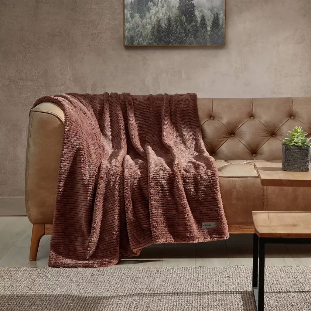 Introducing the Ribbed Super Soft Textured throw collection from Eddie Bauer, a textured plush design reversing to a luxurious micro mink. Made from 100% polyester, these throws are cozy and warm. Features iconic Eddie Bauer logo patch. Machine washable for easy care, follow manufacturer care instructions on label for best results. Perfect for gifting or cuddling up for movie night. Each throw measures 60"wx50"l, making it ideal for travel. Available in four colors, other colors sold separately