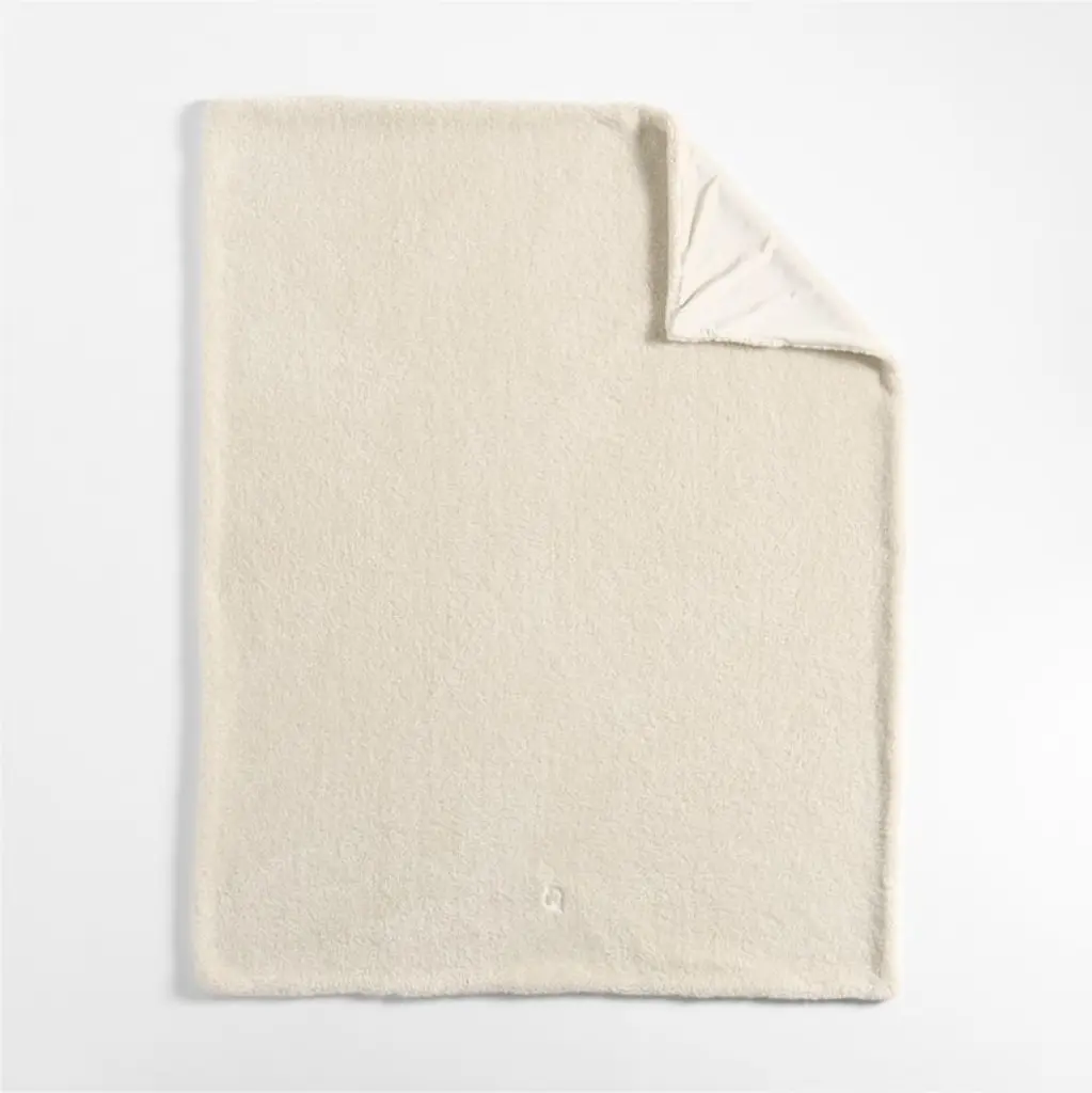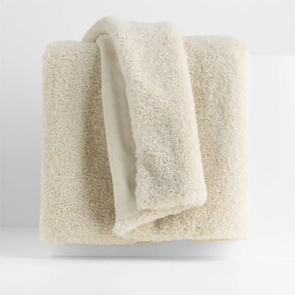 Our supersoft and cuddly throw reproduces the irresistible coziness and plush texture of shearling in recycled polyester. The neutral ivory color harmonizes beautifully with the matching faux shearling pillows, bringing lots of snuggle to a sofa, chair or bed.