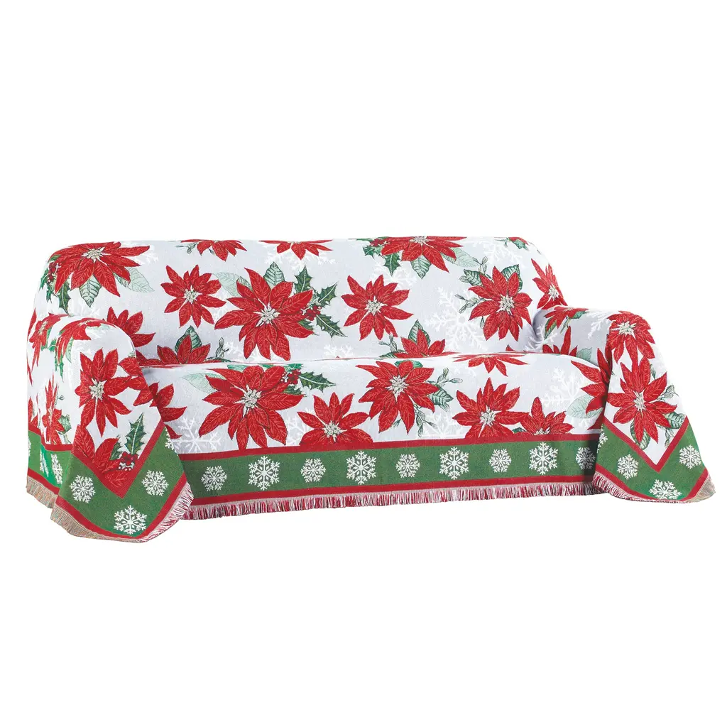 Festive Poinsettia Fringe Border Tapestry Furniture Throw - Sofa
