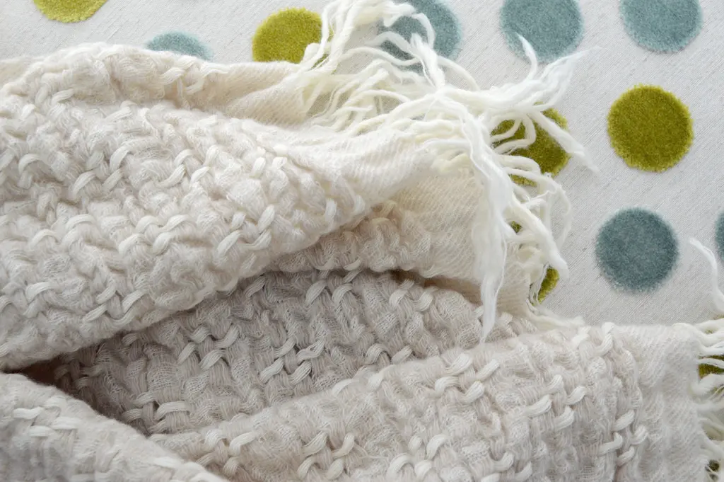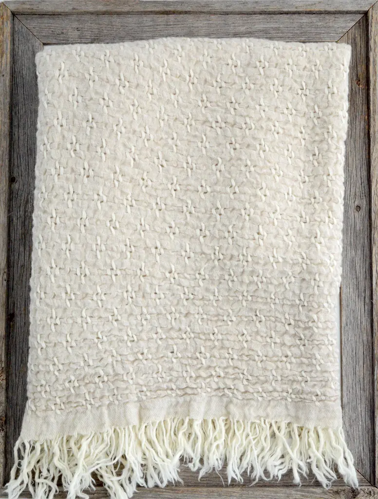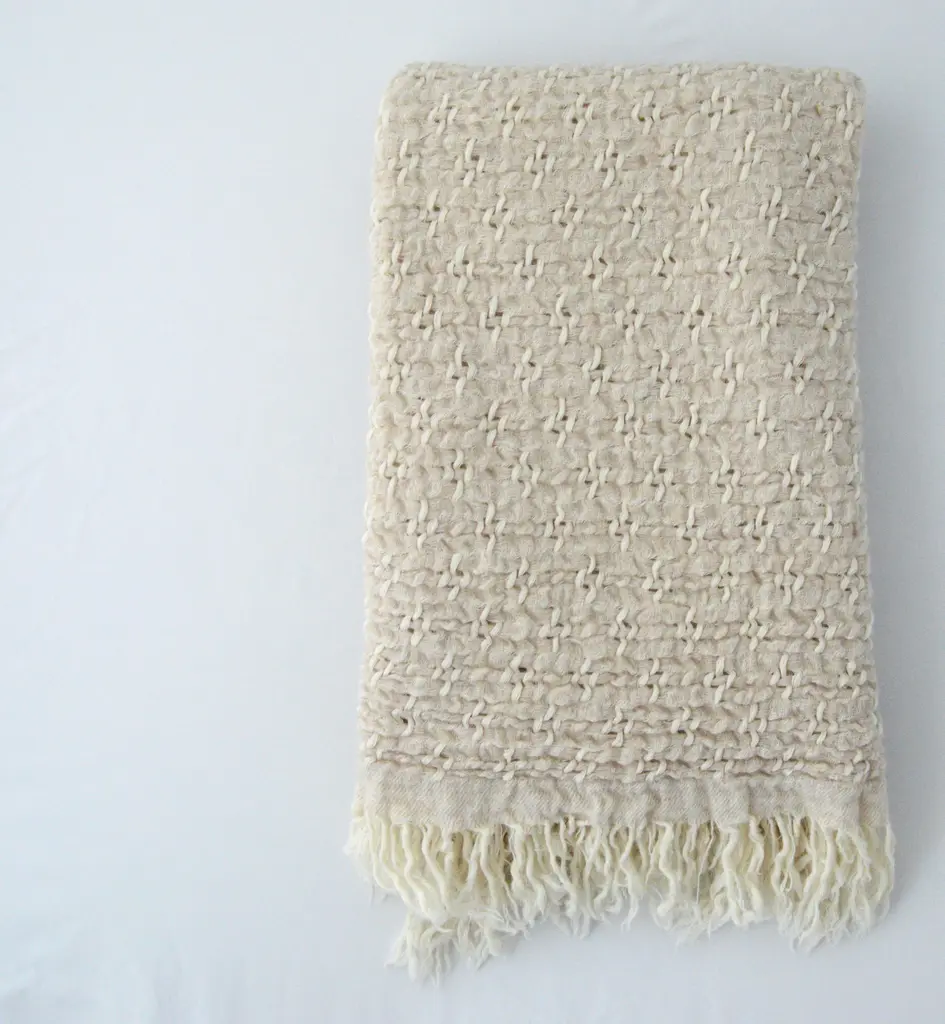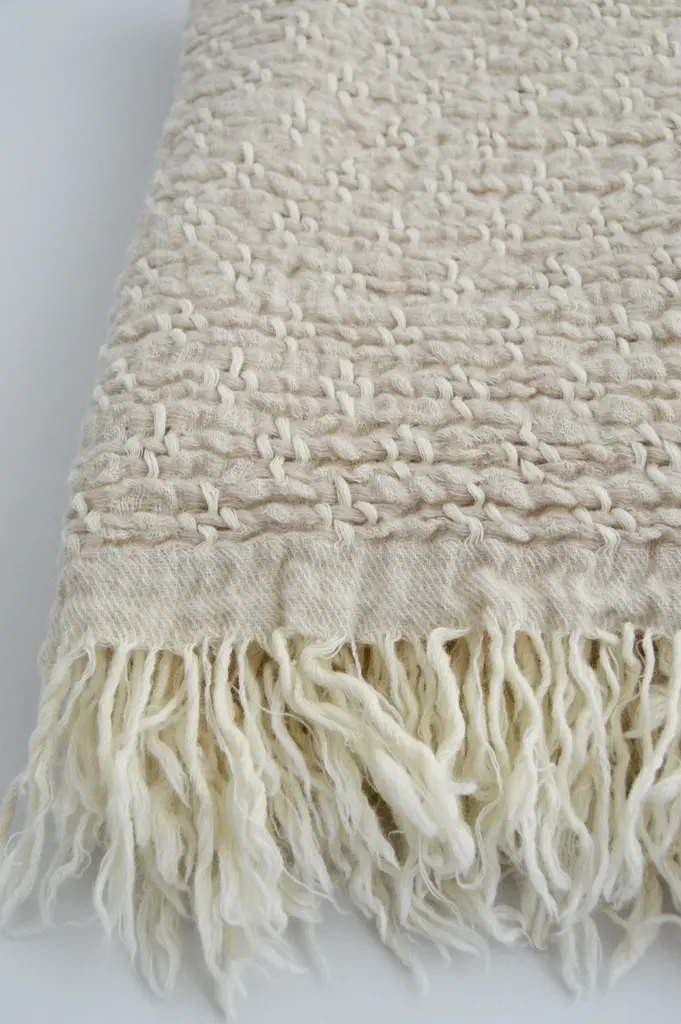 This adorable super soft cream throw is made in Italy with Cashmere and Virgin Wool. Chunky texture for a modern and sophisticated decor. Rich fringes on the edges. Made in Italy. 95% Virgin Wool 5%Cashmere Size 71"x55"