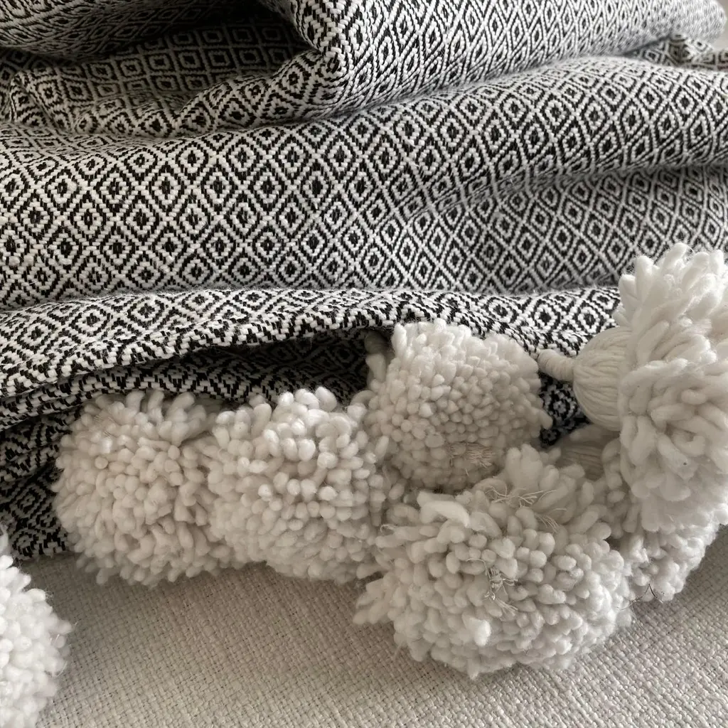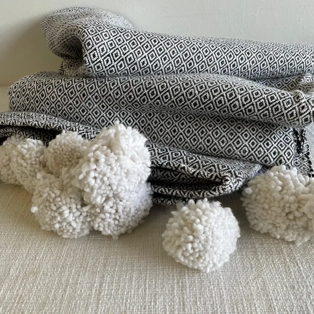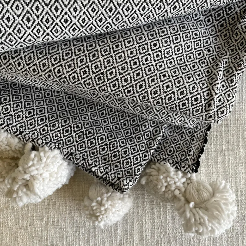 French cotton throw with tasselsCustom loomed in france for Bloom Home Inc.This black and white diamond pattern throw has a heavy weight to it.Measures: 72 x 108.