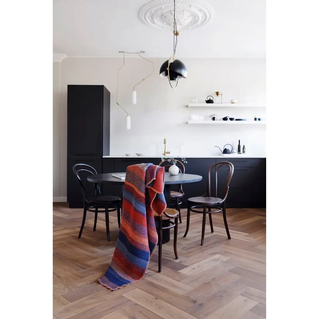Røros Tweed's Fri throw is just the ticket for all those seeking cozy, top-quality Scandinavian textiles. With the Fri series, designers Torbjørn Anderssen and Espen Voll set out to reinterpret the look of traditional table cloths, referred to as løpere in Norwegian. The design duo re-envisioned the repetitive color pattern typical of the original design and established a zigzag motif. With its soft visual effect, Røros Tweed’s Fri throw draws you in to feel its pleasant surface and curl up with your novel of choice. High-quality home textiles by the Norwegian Røros Tweed are made from 100% Norwegian lambswool, shorn from sheep living free in the mountains. The manufacturing process is also kept fully in Norway to maintain high standards, which have been essential to the company’s continued success since the 1940s.