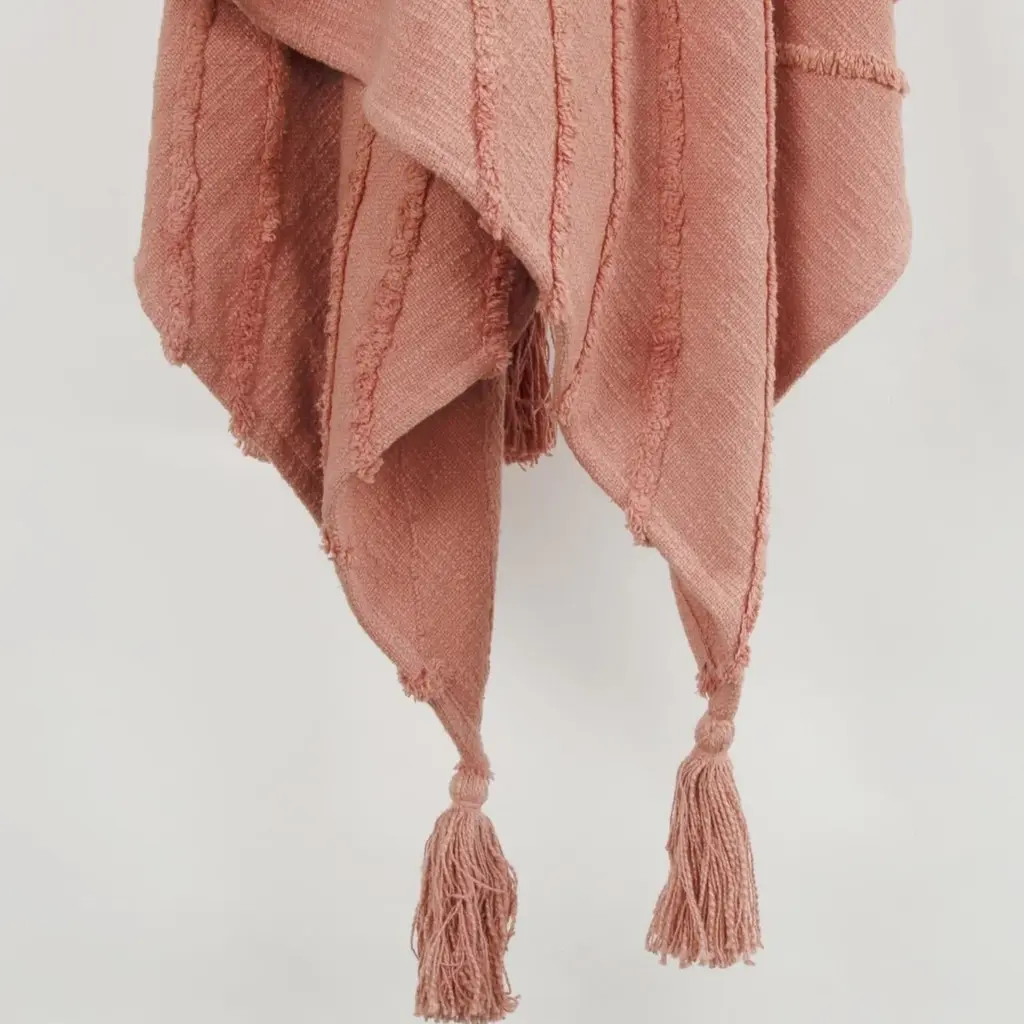 With intricate hand-tufted detailing, this gorgeous throw is the epitome of refined boho chic style, woven using slubbed yarns for a textured, transitional ikat design. In a rich coral hue, this piece will add a pop of color to any décor, with the added benefit of ultra comfort. The warp yarns are hand-tied into tassels, adding a finishing element of refined texture and warmth. This medium to heavy-weight throw is specially washed for extra softness, perfect for snuggling on chilly evenings. Add an air of sophistication and coziness to your living room, bedroom, or outdoor space with this hand-crafted, high-quality throw. This 50" x 60" textured cotton throw is not only functional, but features a stunning design in beautiful coral.