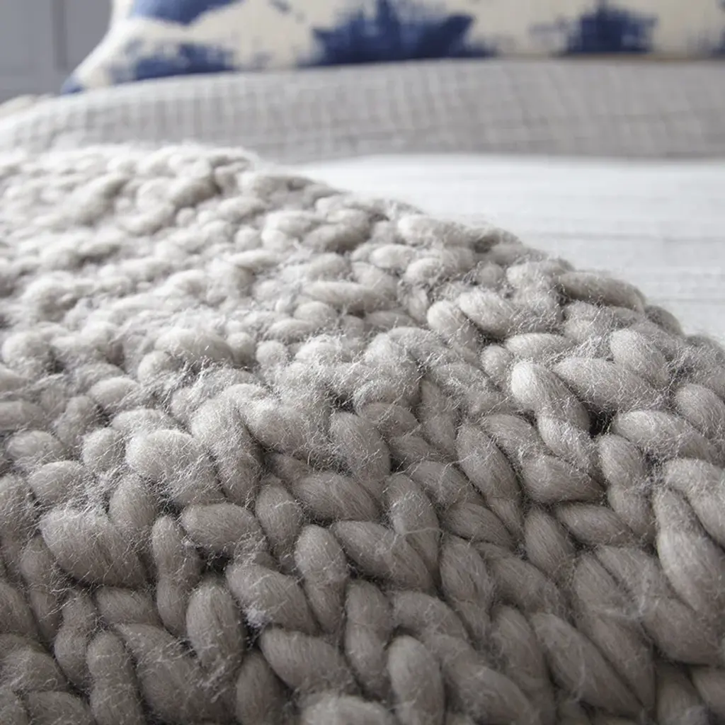 This throw features chunky knit constructions made from acrylic fibers with a hint of wool. This throw's comfort is sure to satisfy or amplify a bed's aesthetic.