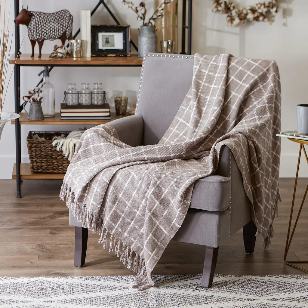 Add a cozy, stylish accent to your space with the Gray Checked Plaid Throw. Featuring a classic checked plaid pattern in soft gray tones, this throw brings a touch of timeless elegance to any room. Made from high-quality, comfortable fabric, it’s perfect for snuggling up on chilly evenings or as a decorative piece on your sofa or bed. The neutral color palette easily complements a variety of home styles, from modern to rustic. Whether you're looking for warmth or a chic finishing touch, the Gray Checked Plaid Throw is the perfect addition to your home.